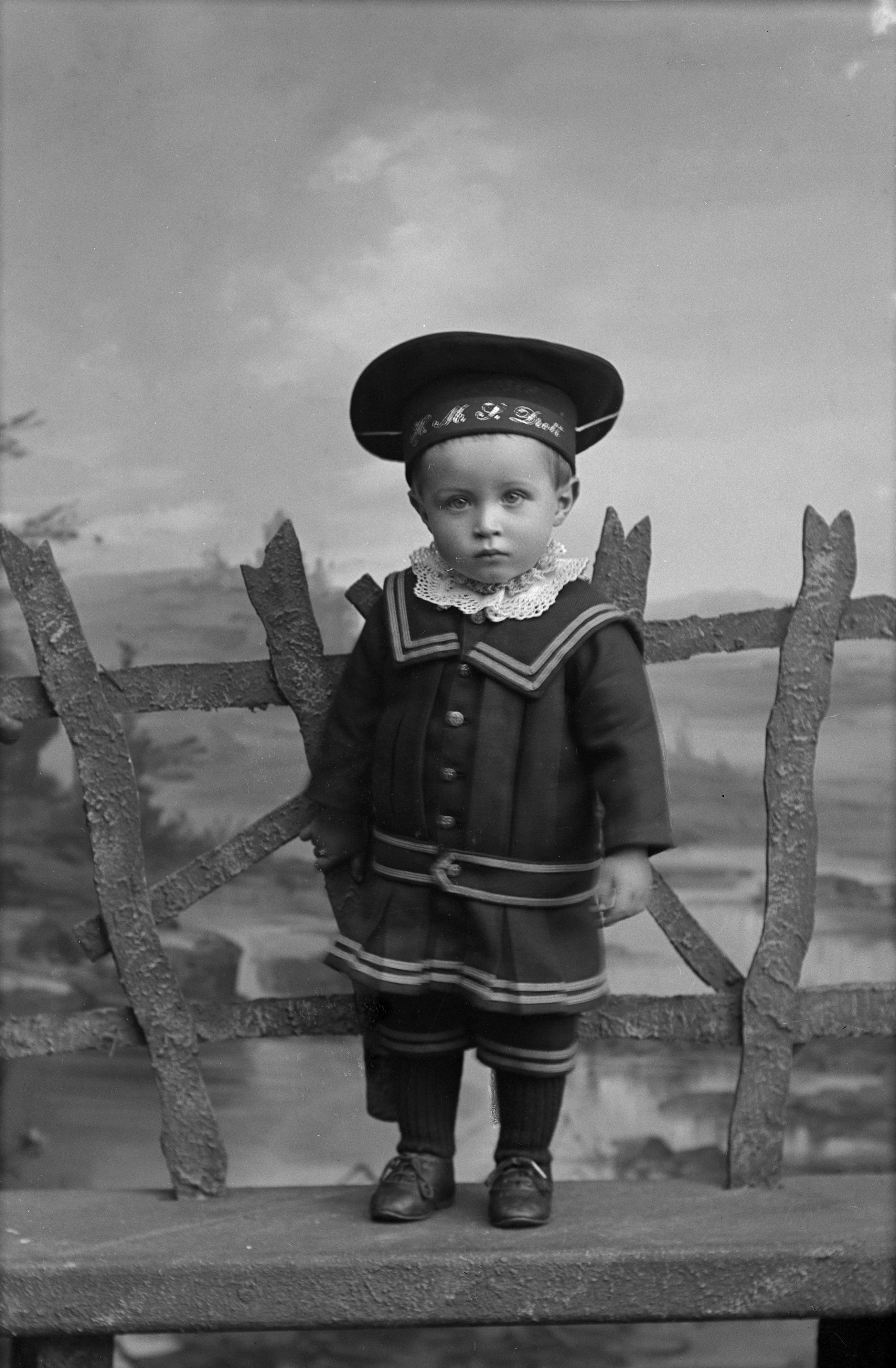 Porträtt i helfigur av Jöns Nilssons son, iklädd bredbrättad mössa med broderier, stående vid staket. Ateljéfond med slätt- och skogsmotiv utgör bakgrunden.