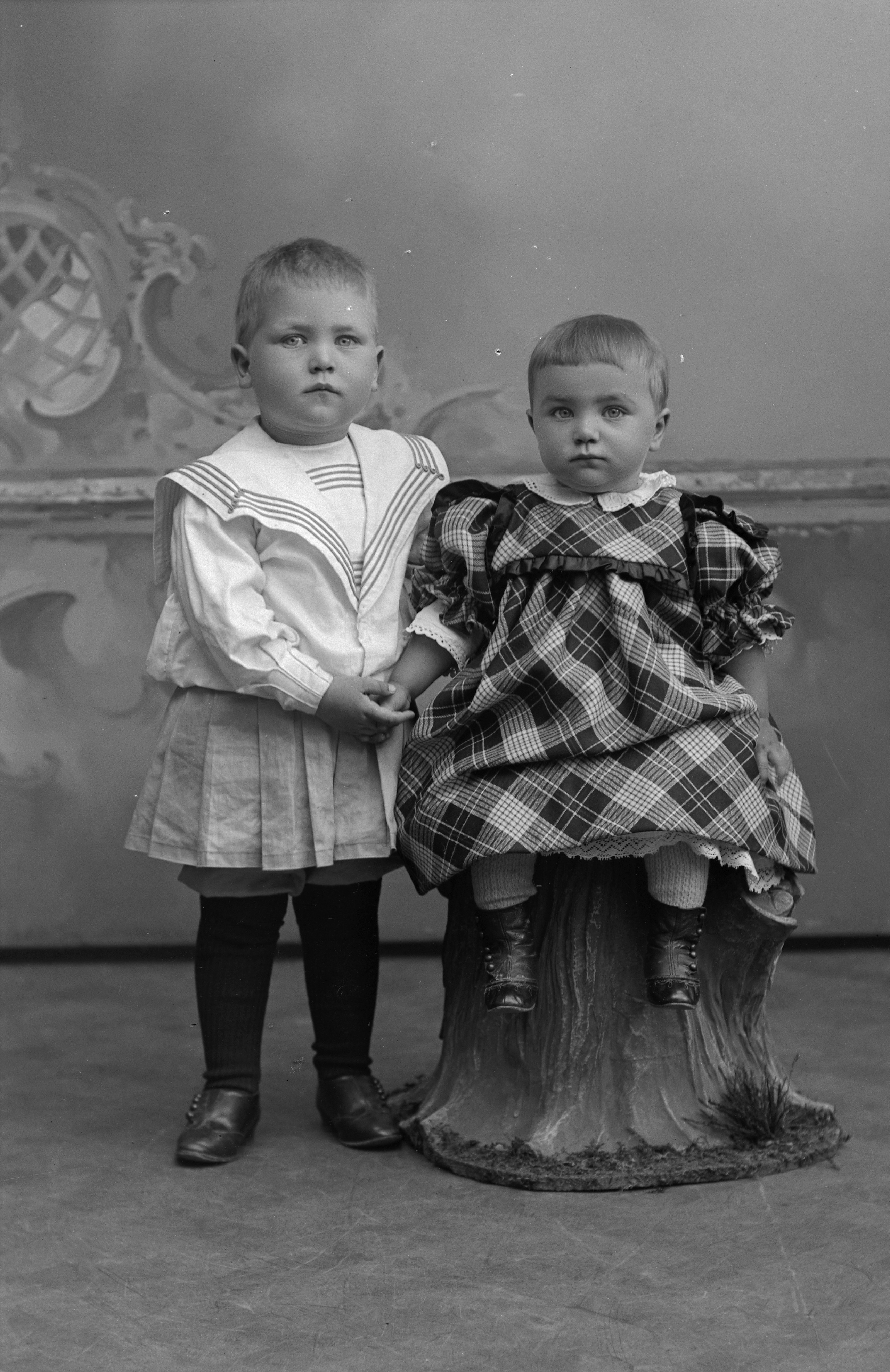 Porträtt i helfigur av fru Lindbergs son och dotter. Sonen iklädd sjömanskostym, dottern sittande på stubbe.