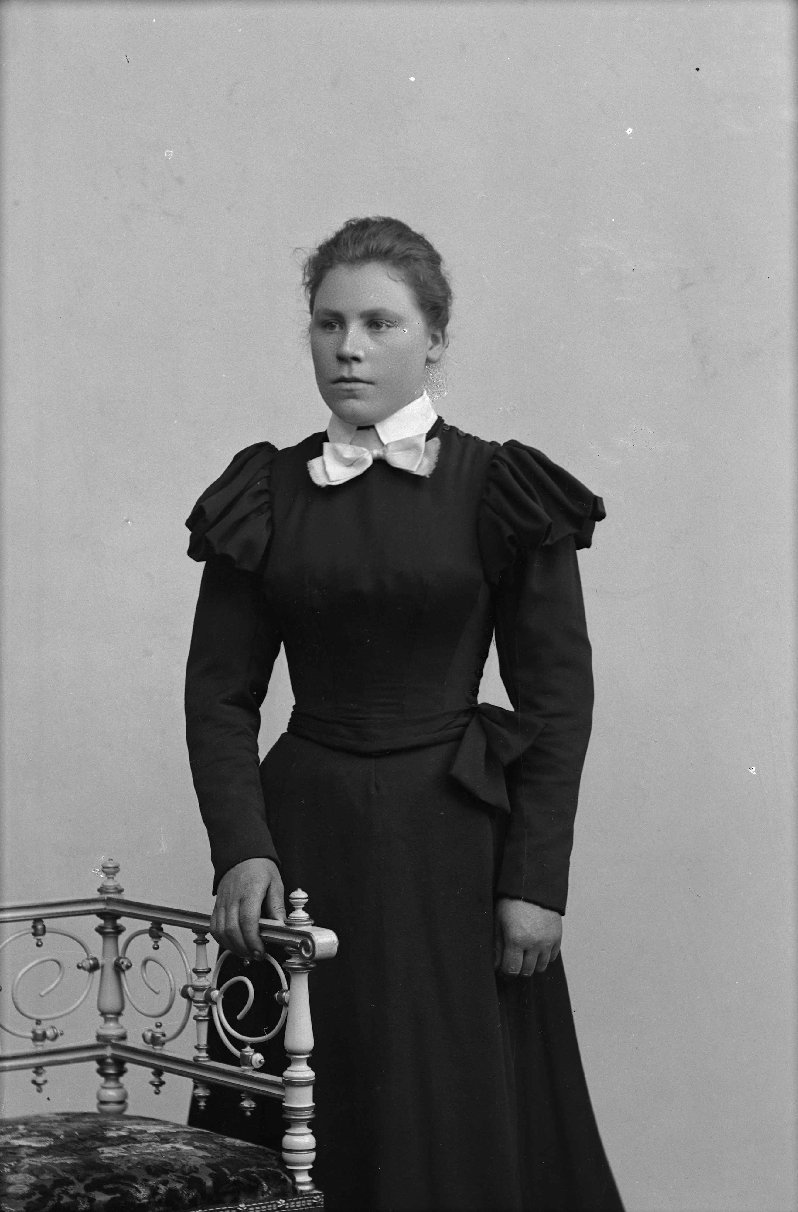 Porträtt i helfigur av Sigrid Löfstedt, stående vid stol.
