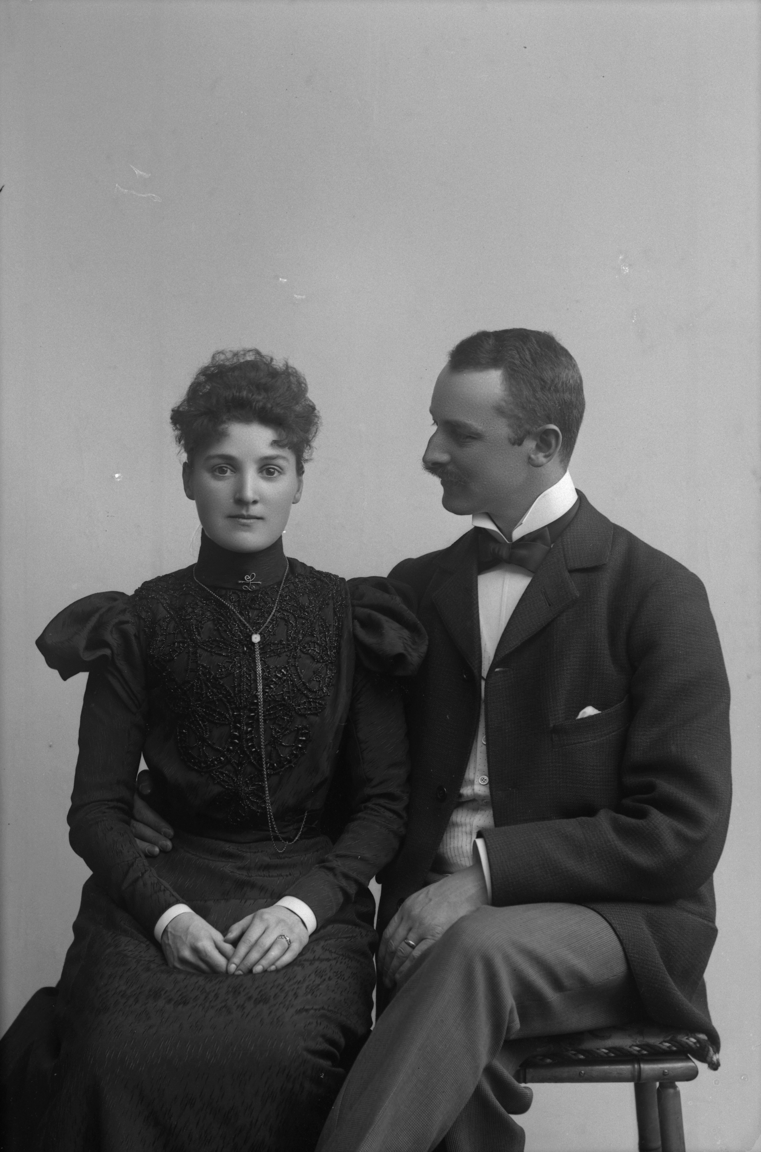 Porträtt i helfigur av herr Hellberg med fru, sittande. Makens ansikte i profil.