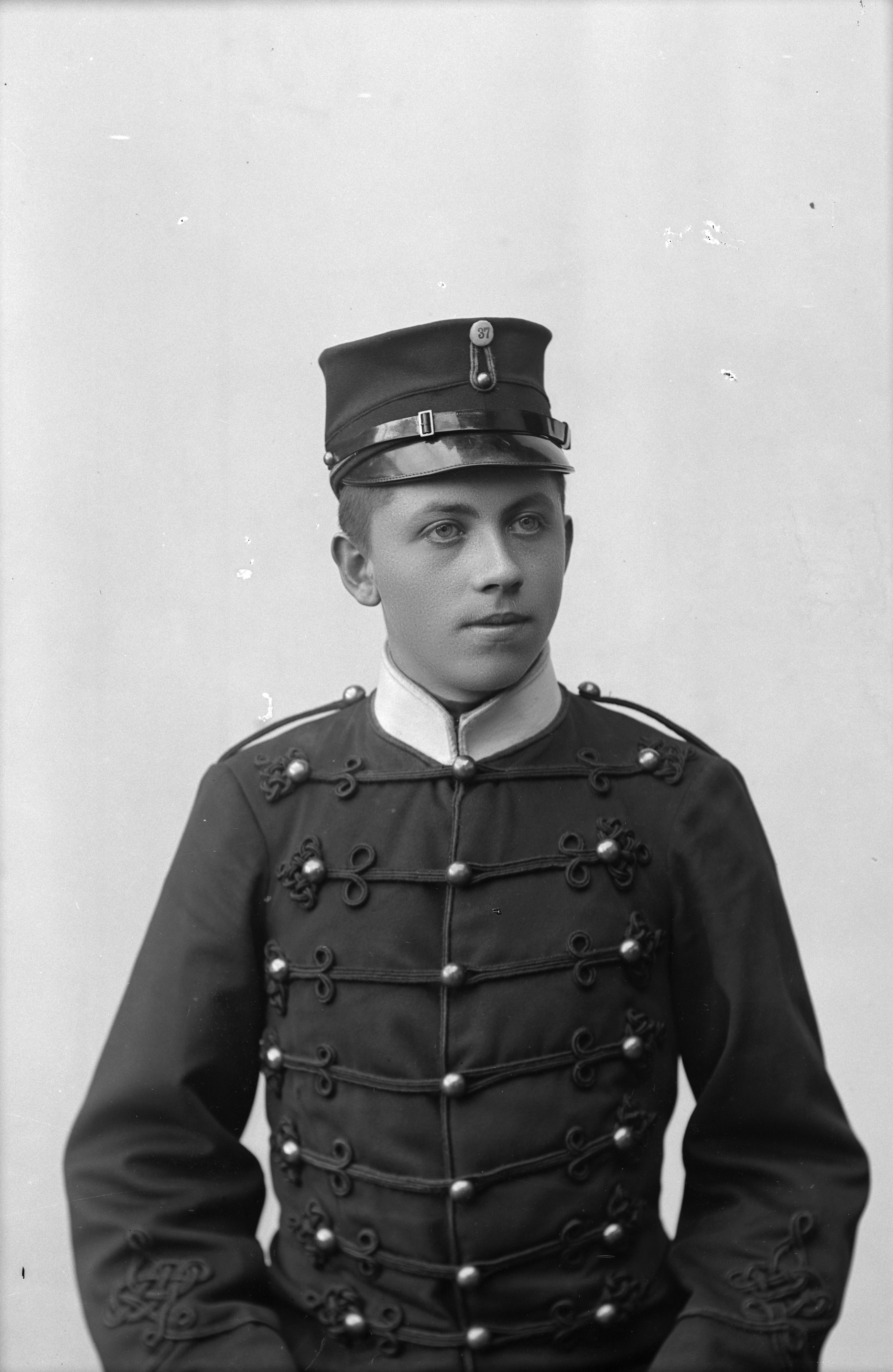 Porträtt i halvfigur av N. Månsson, iklädd militäruniform och -mössa.