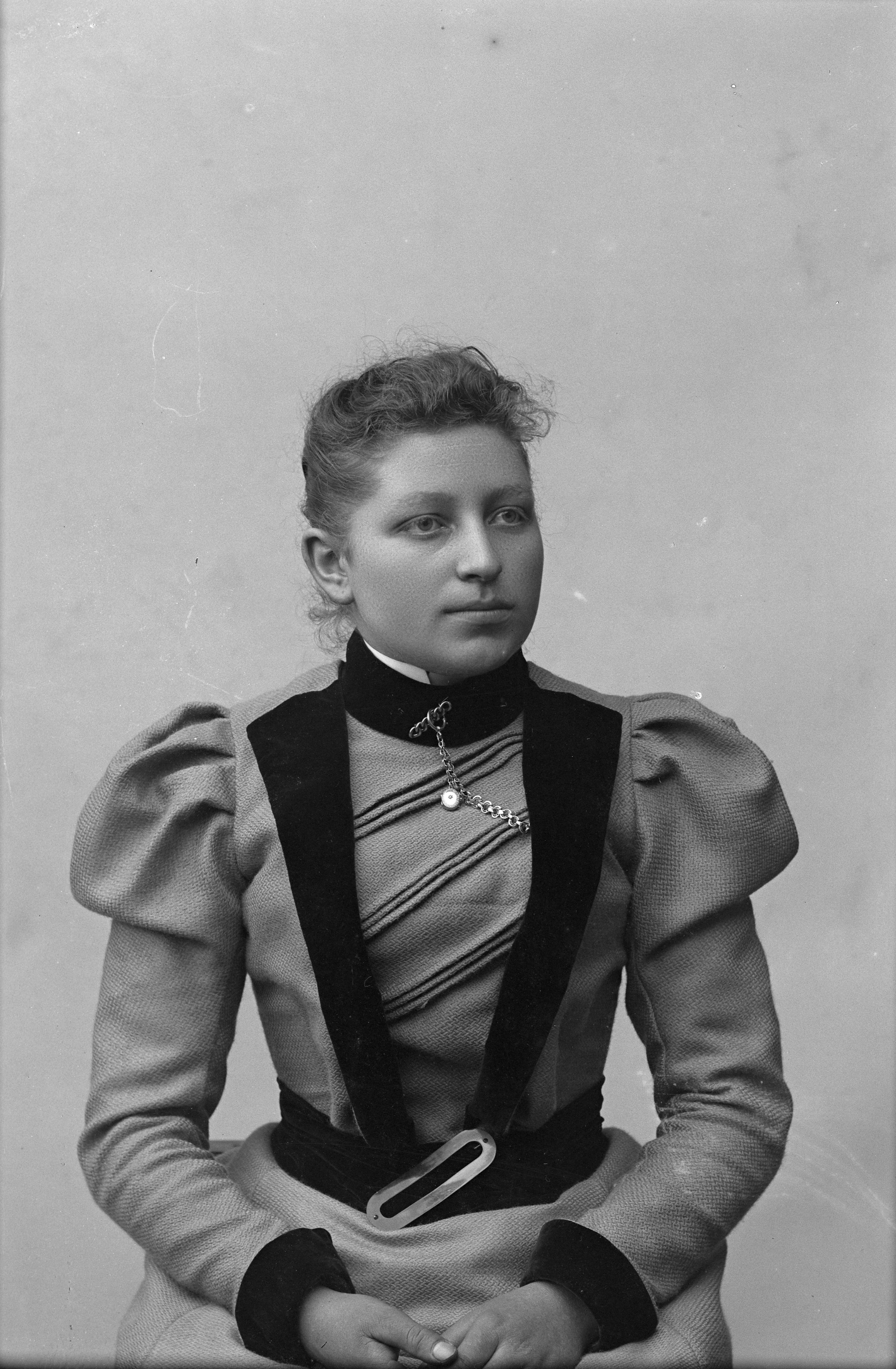 Beskrivning: Porträtt i halvfigur av Erika Jönsson vid Dalby Gästgivaregård.