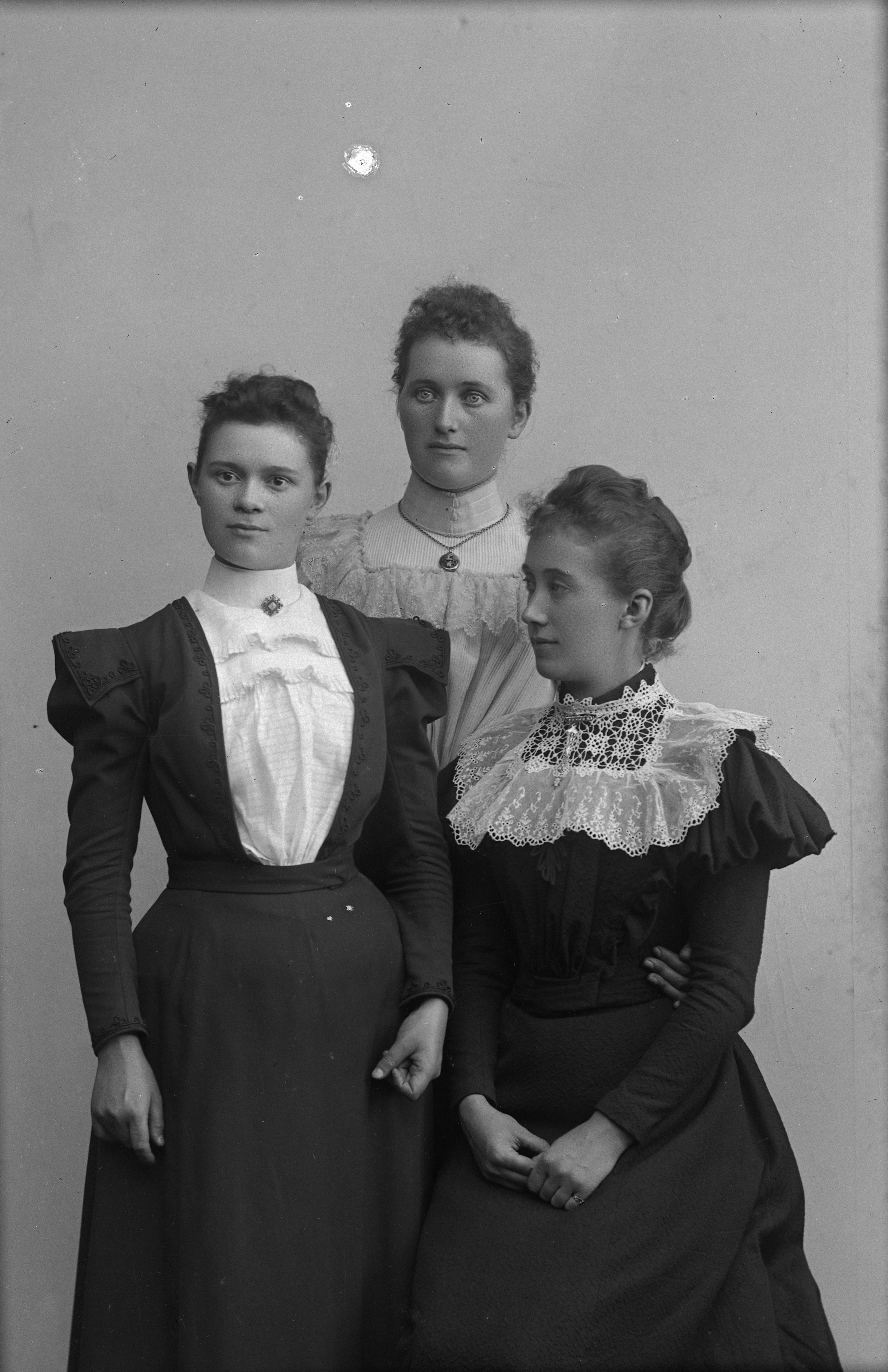 Porträtt i helfigur av småskollärarinnan Thilda Larsson med okänt sällskap, två andra kvinnor.