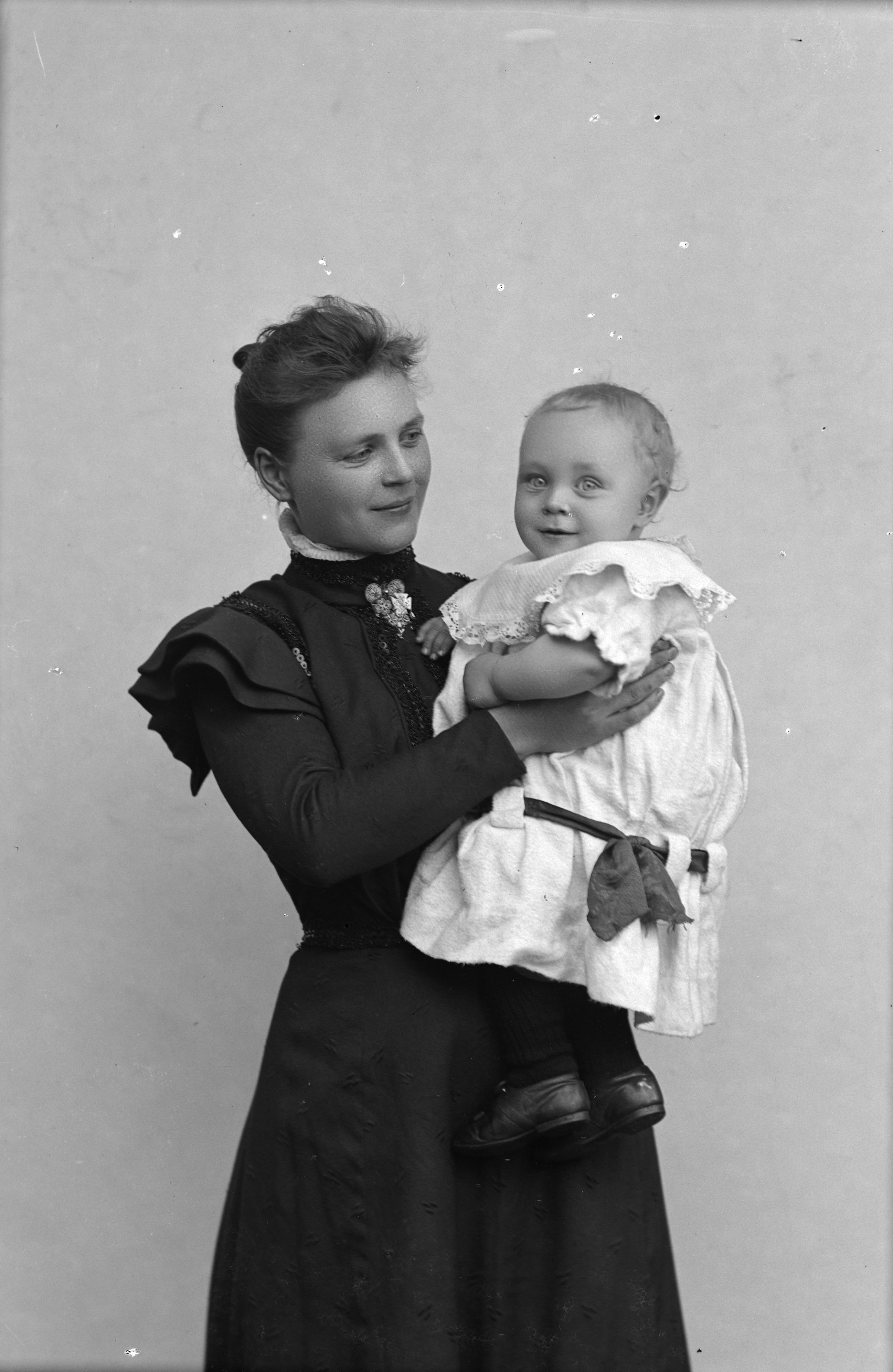 Porträtt i helfigur av fru Brandt, hållande sitt barn i famnen.