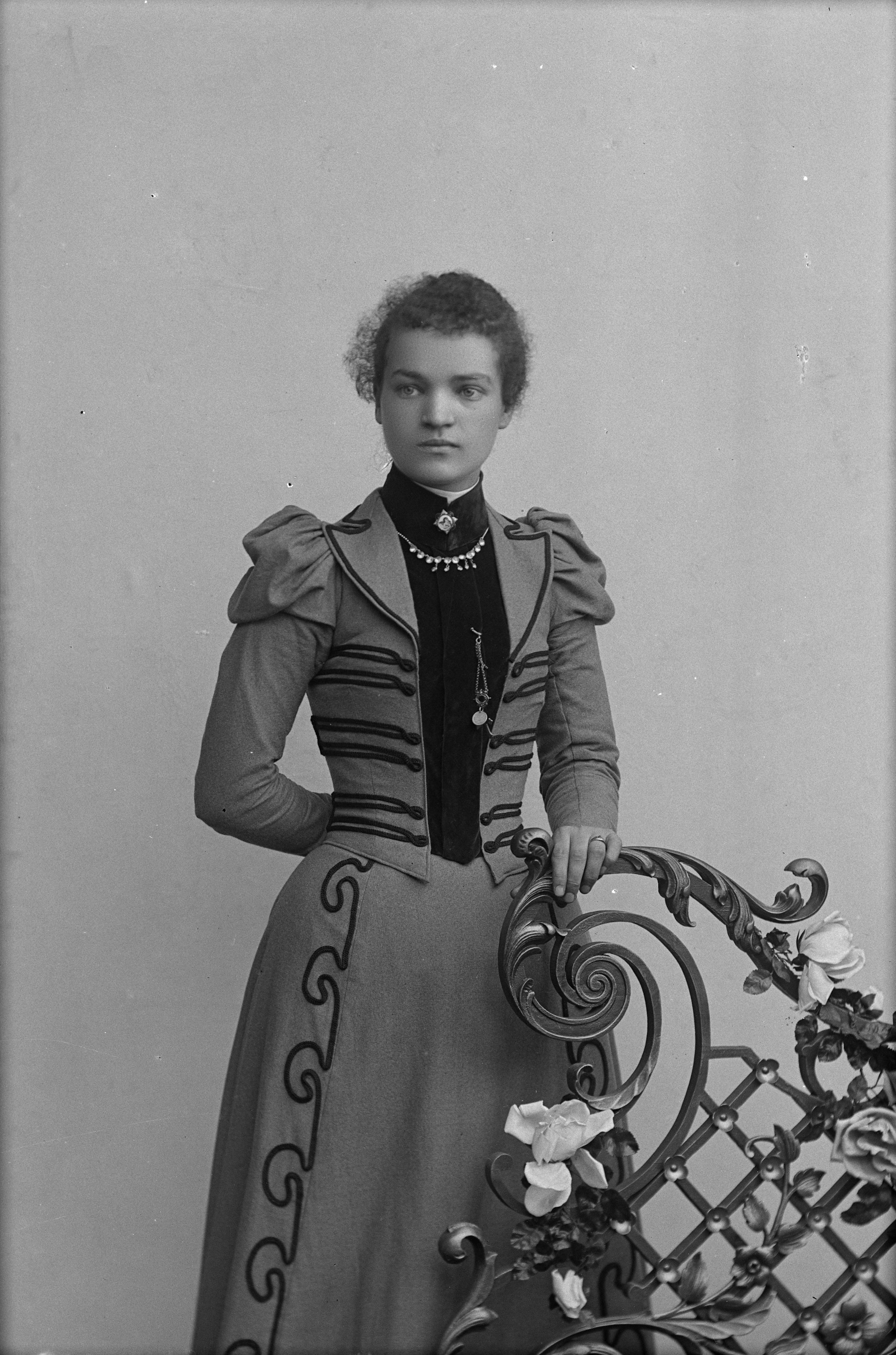 Porträtt i helfigur av sömmerskan Jenny Sohl, stående vid spaljé.