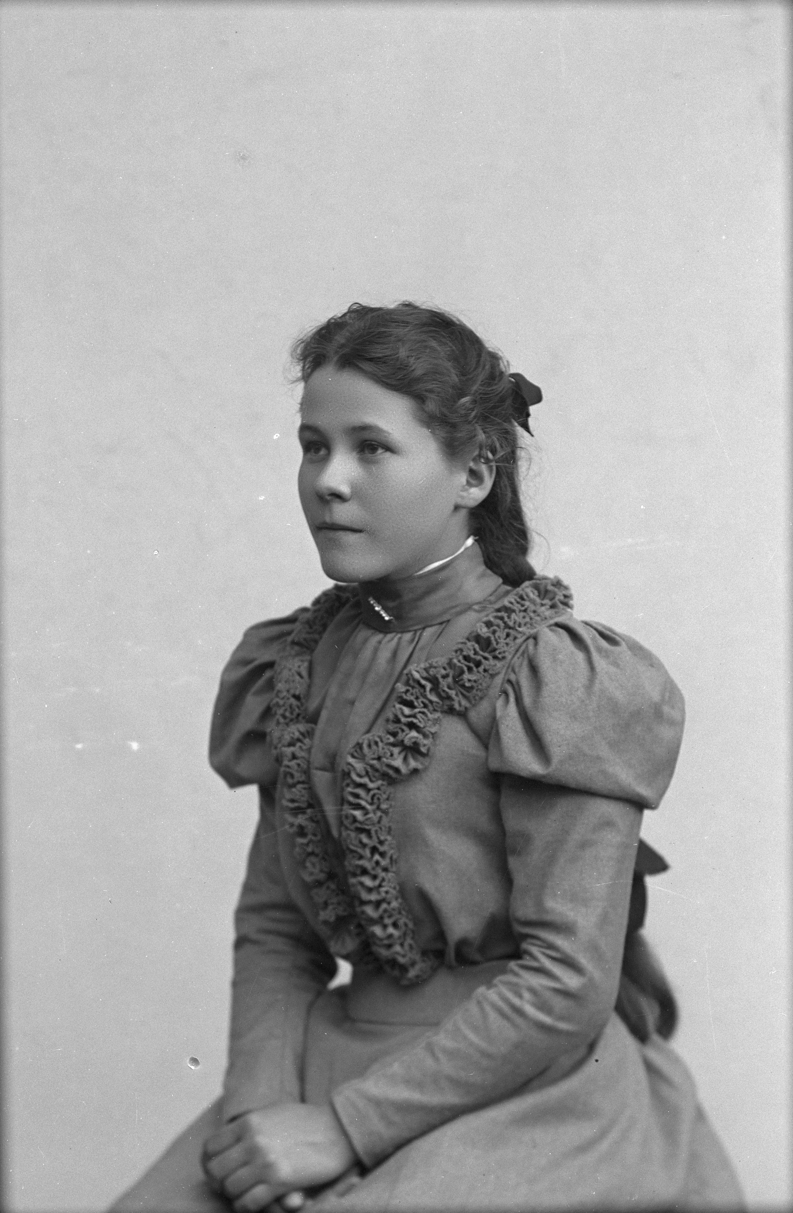 Beskrivning: Porträtt i halvfigur av Helga Brunche.
