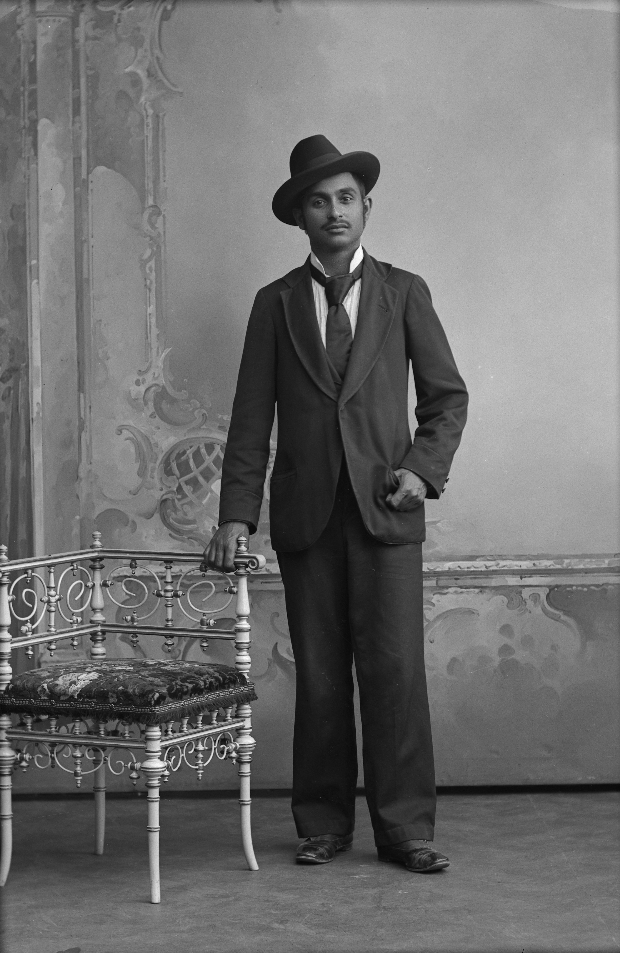 Porträtt i halvfigur av Alexander Ungars, iklädd hatt, stående vid stol.