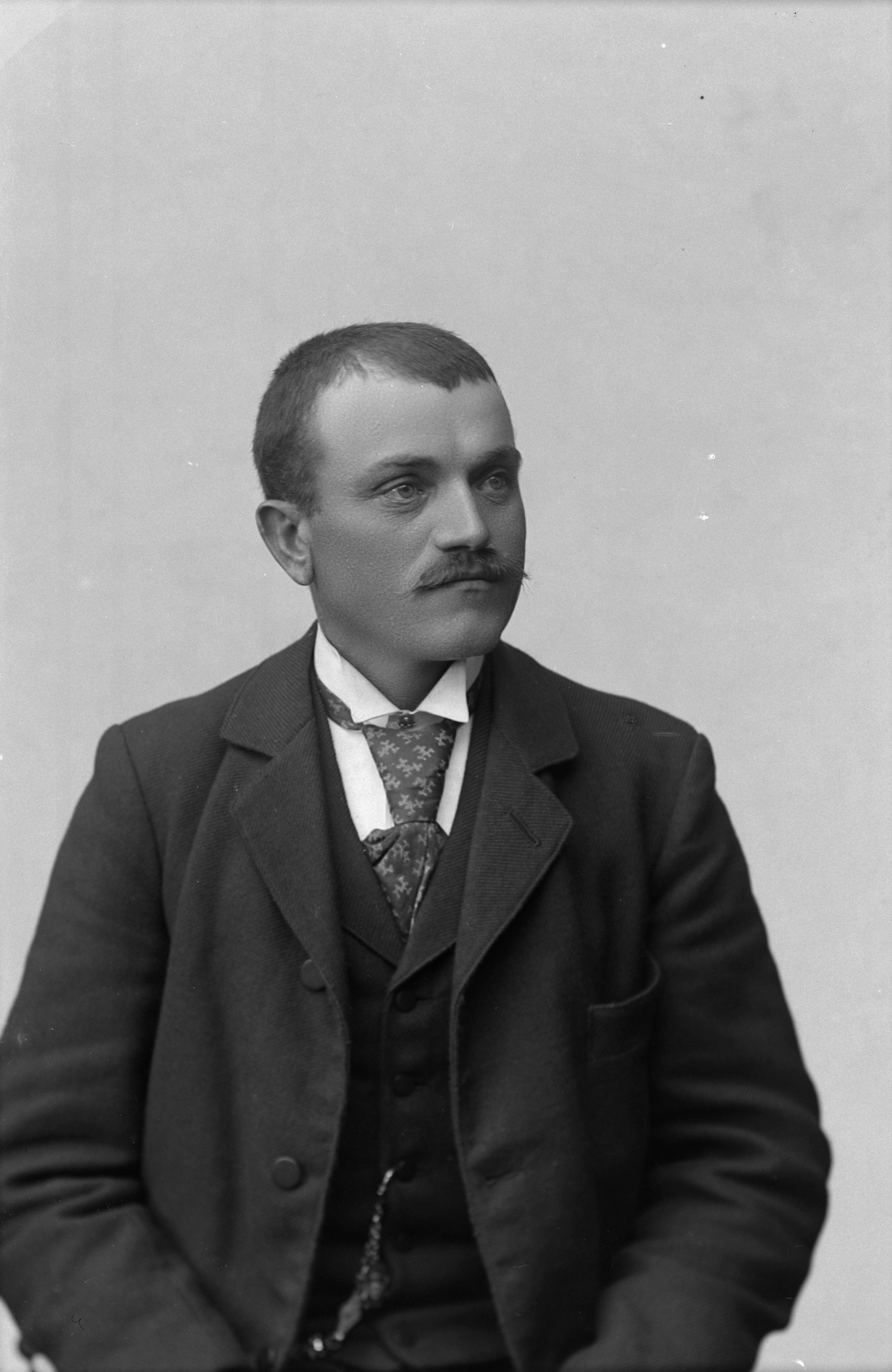 Beskrivning: Porträtt i halvfigur av P. O. Olsson vid Klagstorps Kalkbrott.