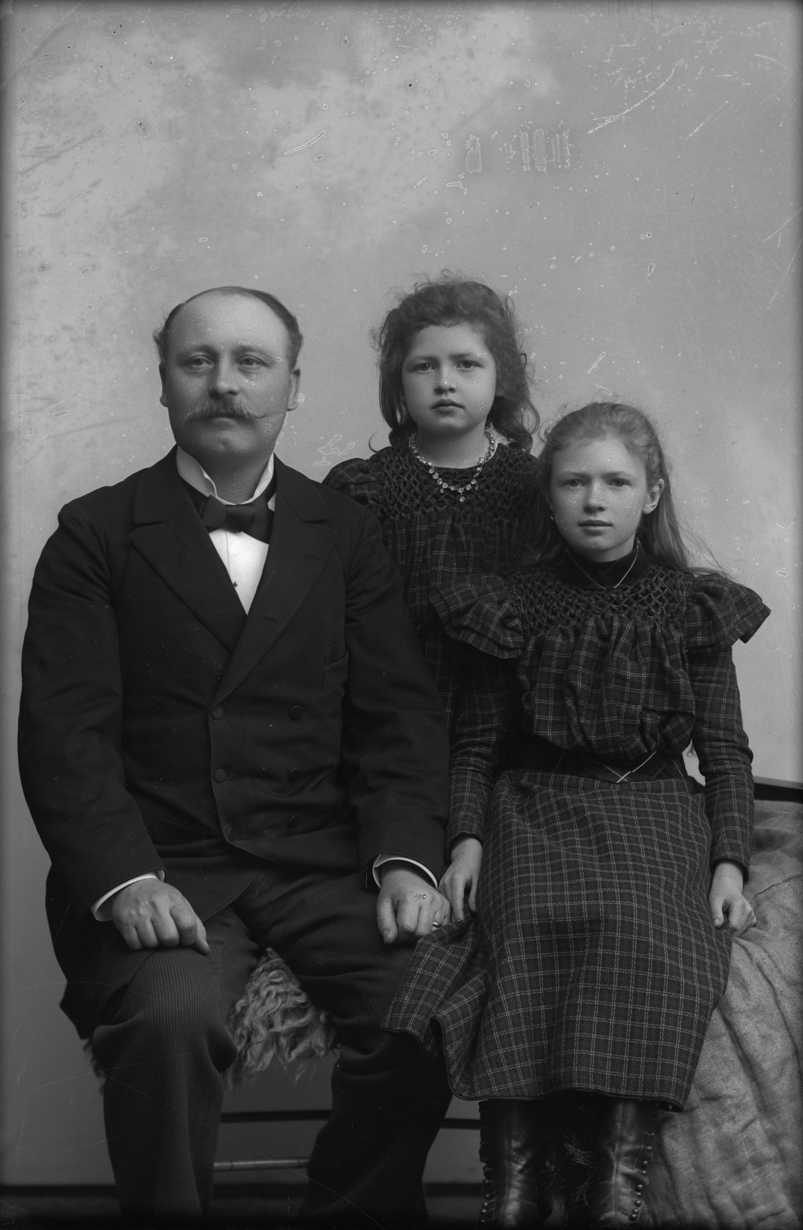 Beskrivning: Porträtt i helfigur av herr Ekberg med döttrar.