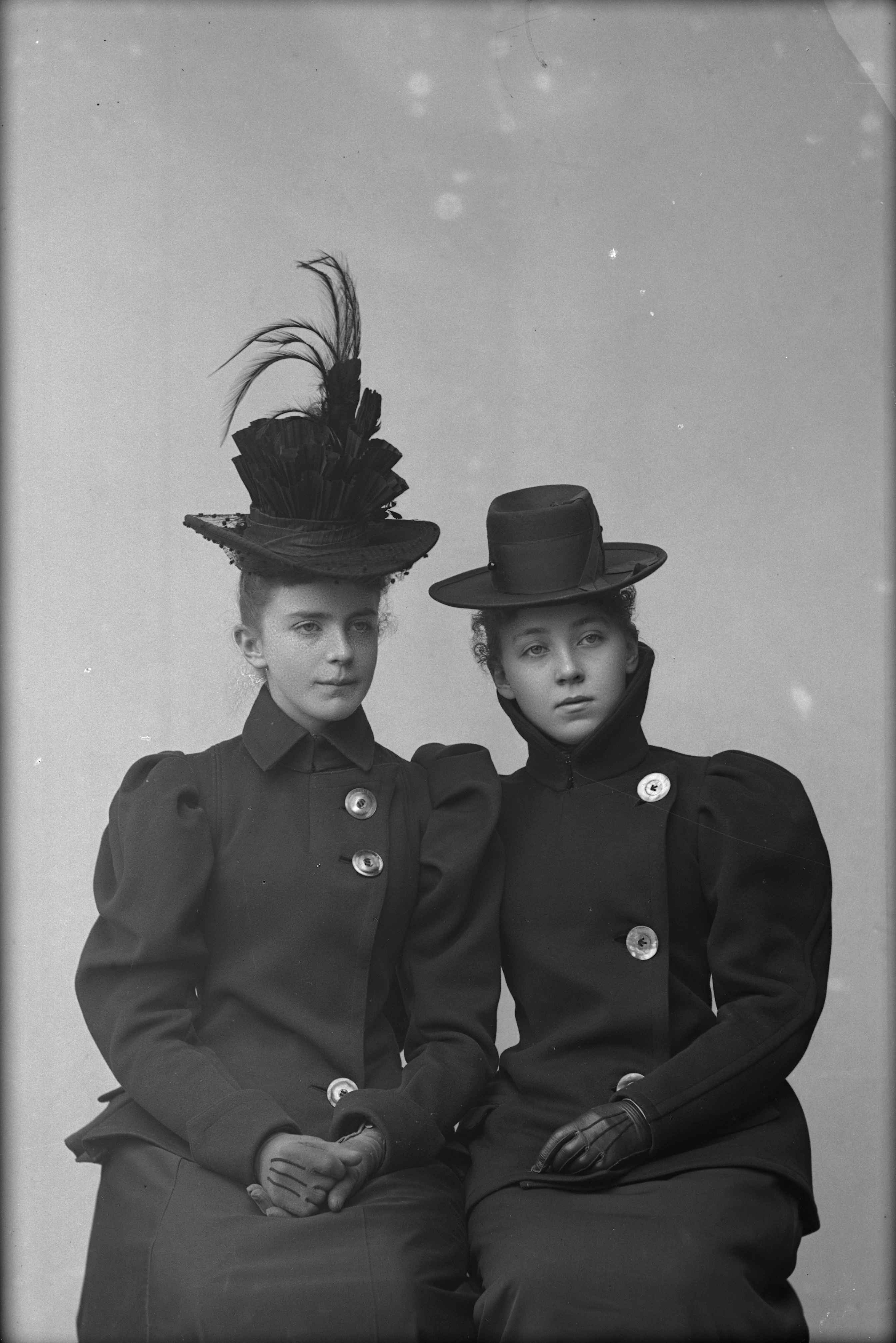 Porträtt i helfigur av fröken Liljedahl med okänd kvinna, båda iklädda hattar och kappor.