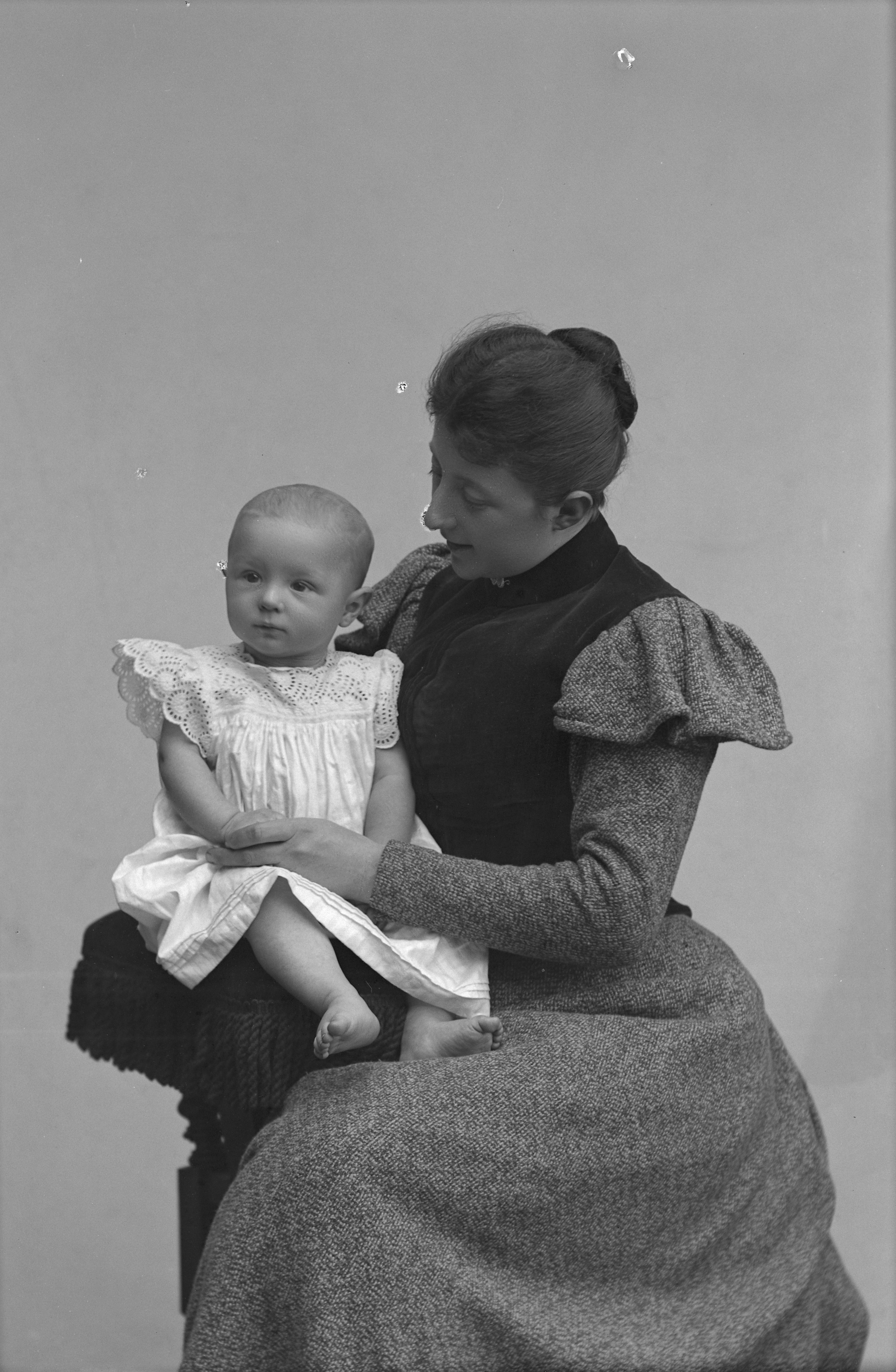 Porträtt i helfigur av Elida Larsson, sittande, hållande siin son i knät.