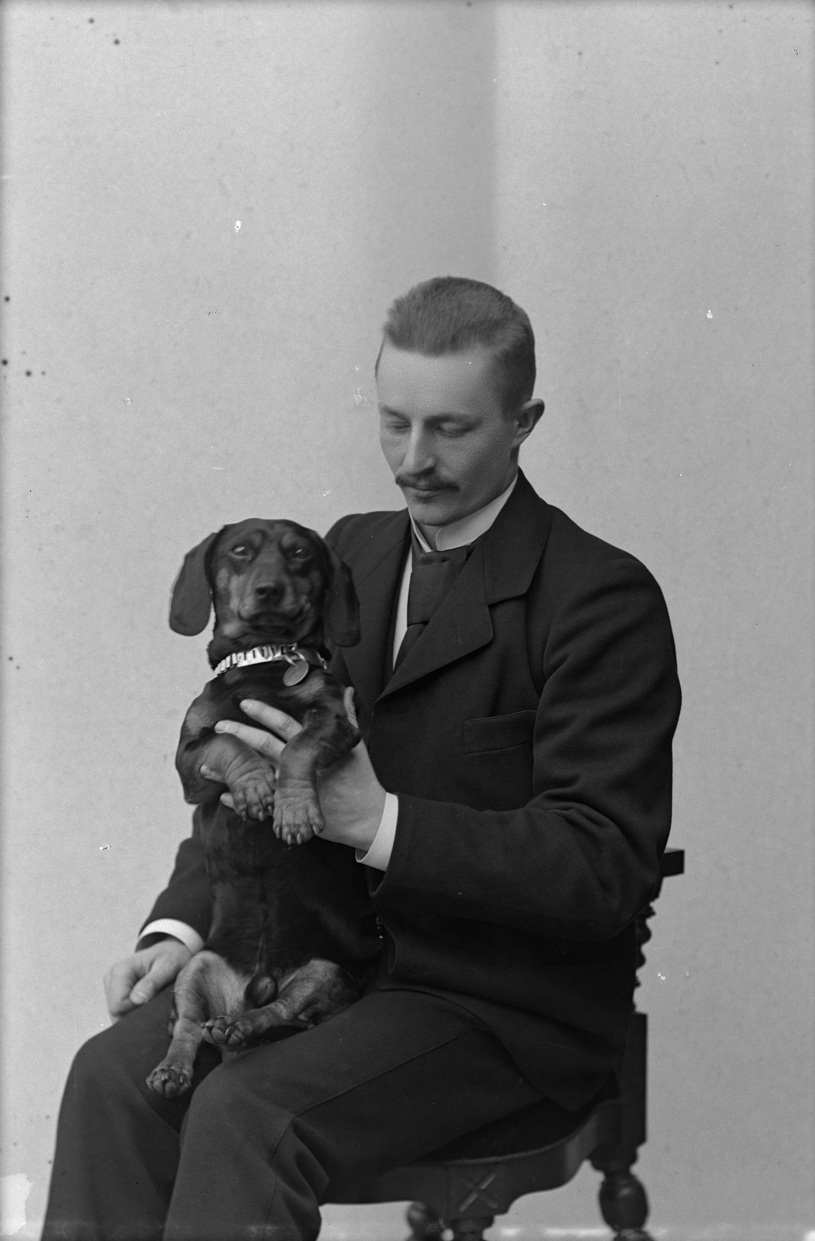 Beskrivning: Porträtt i helfigur av ingenjören, linjedirektör Sven Otto Larsson Lennman, hållande sin hund i knät.