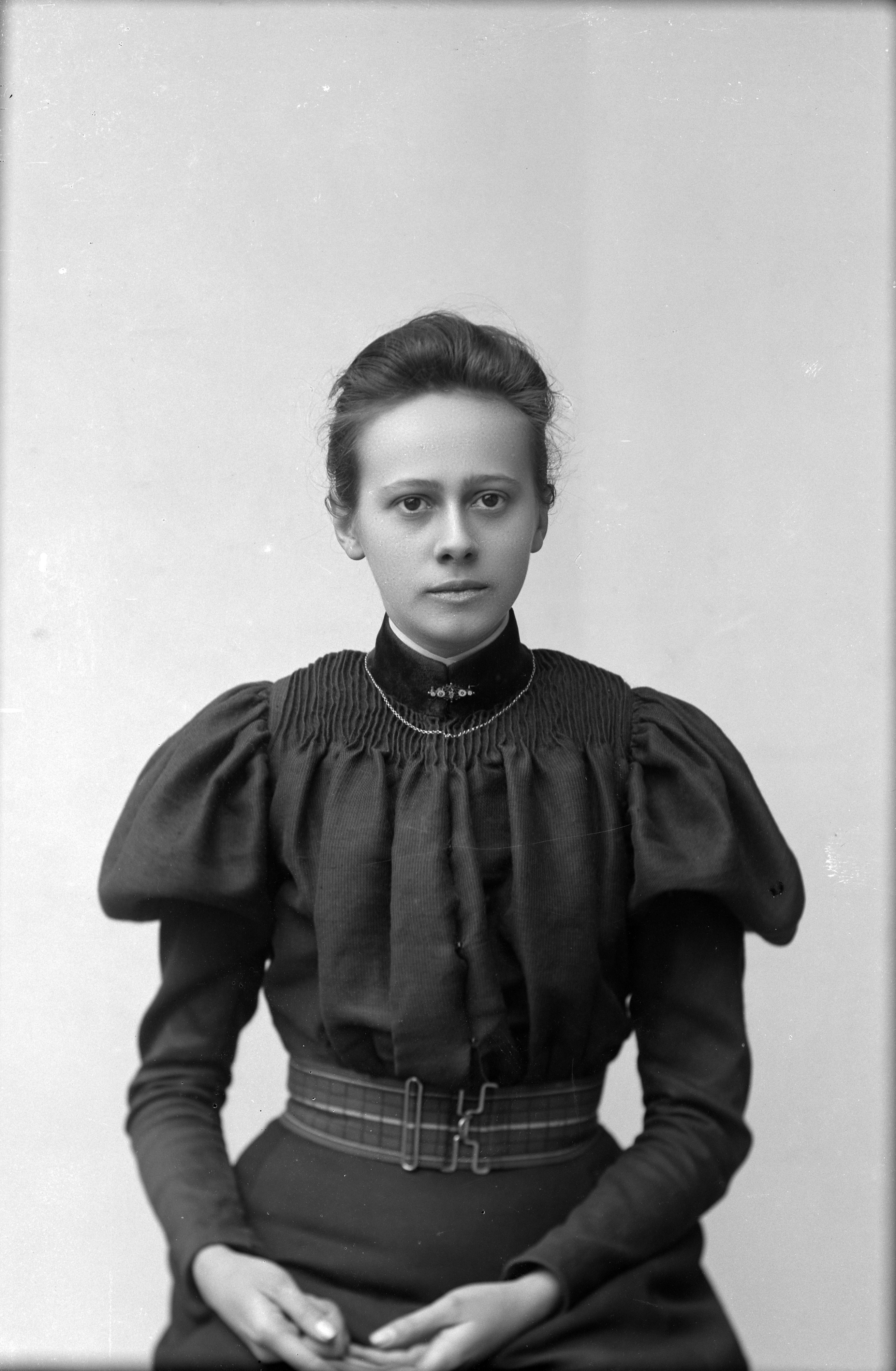 Beskrivning: Porträtt i halvfigur av fröken Scholander.