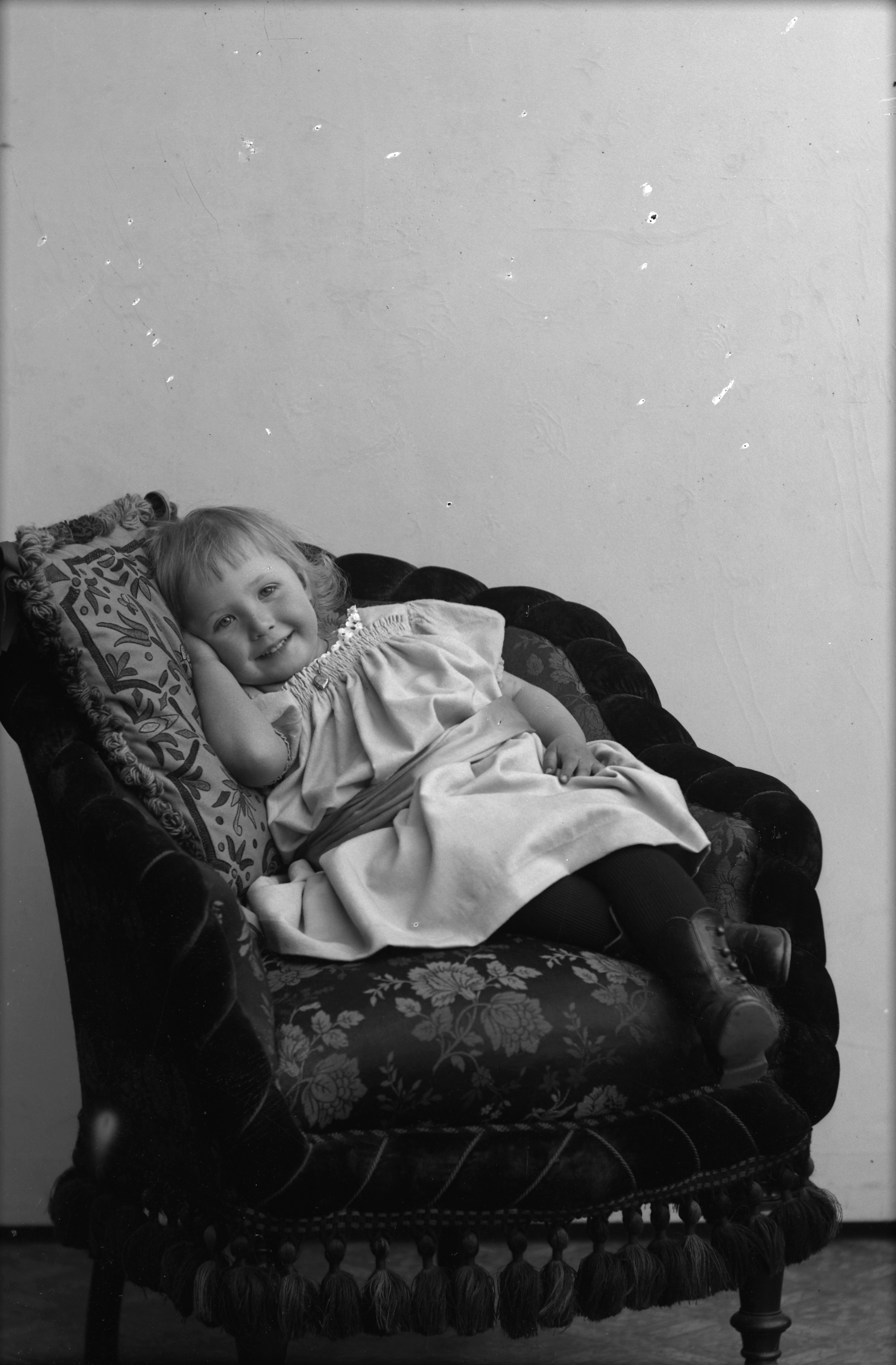 Porträtt i helfigur av Kerstin Ingeborg Ottosson, sittande i stol.