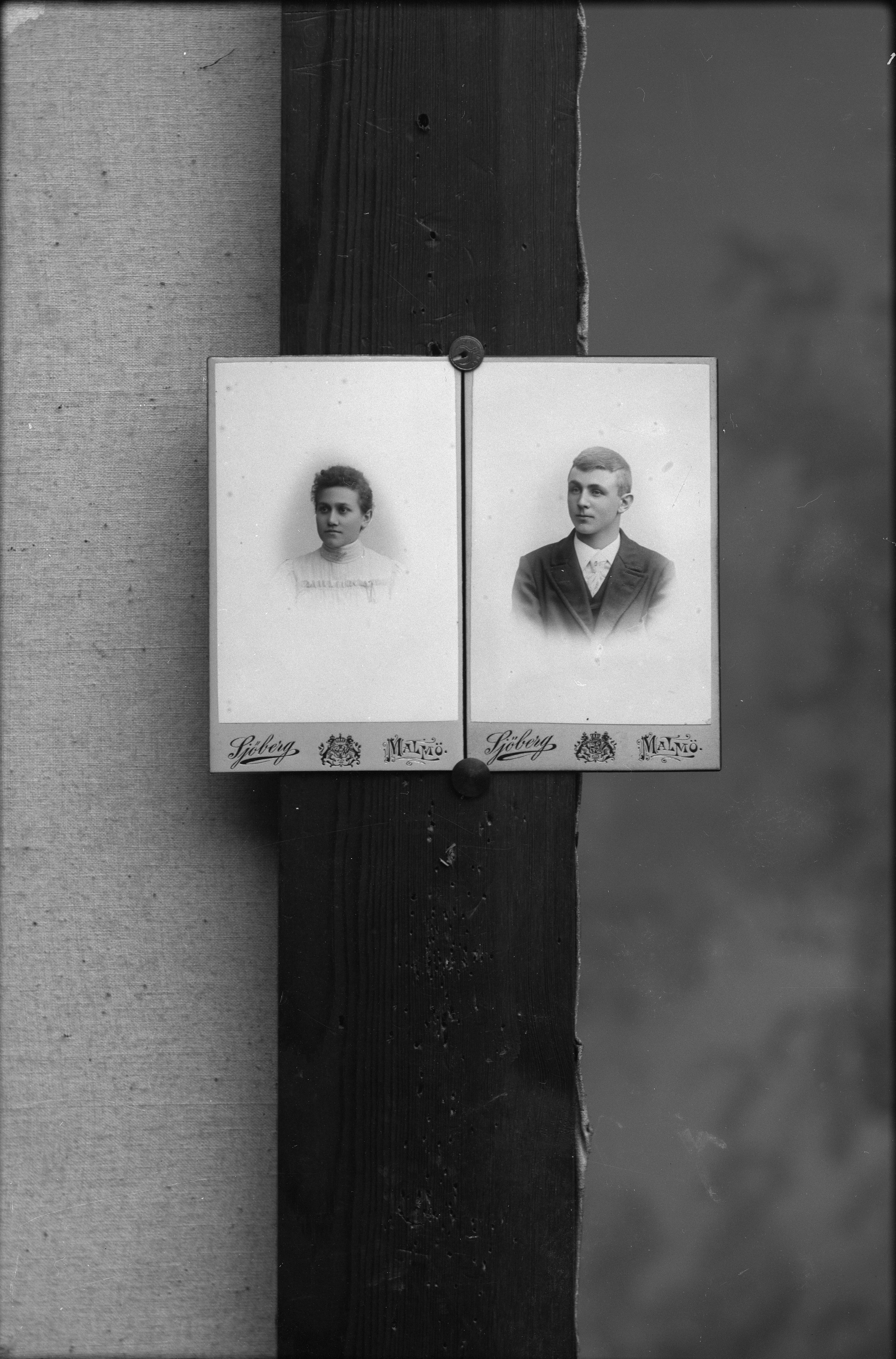 Två porträtt i halvfigur av oidentifierad man och kvinna. Visitkort med ateljélogotyper, "Sjöberg /Malmö".