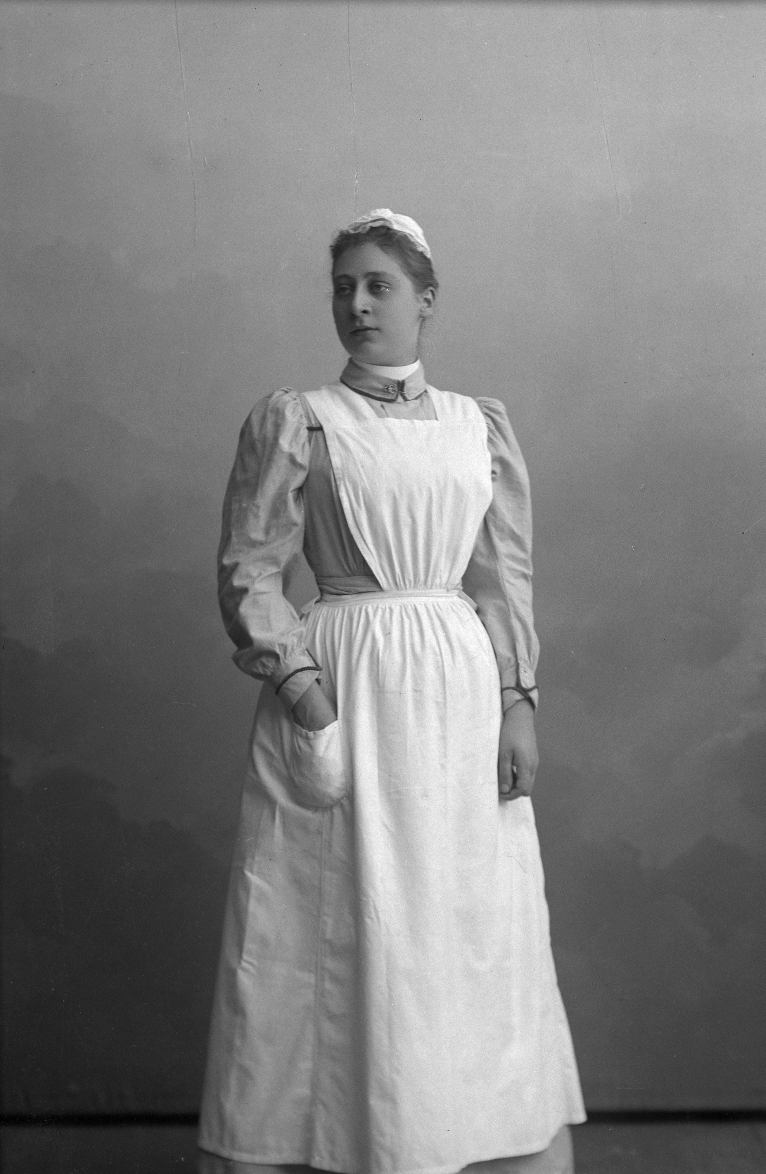 Porträtt i helfigur av fröken Aurell, iklädd hätta och förkläde, möjligen yrkesklädsel.