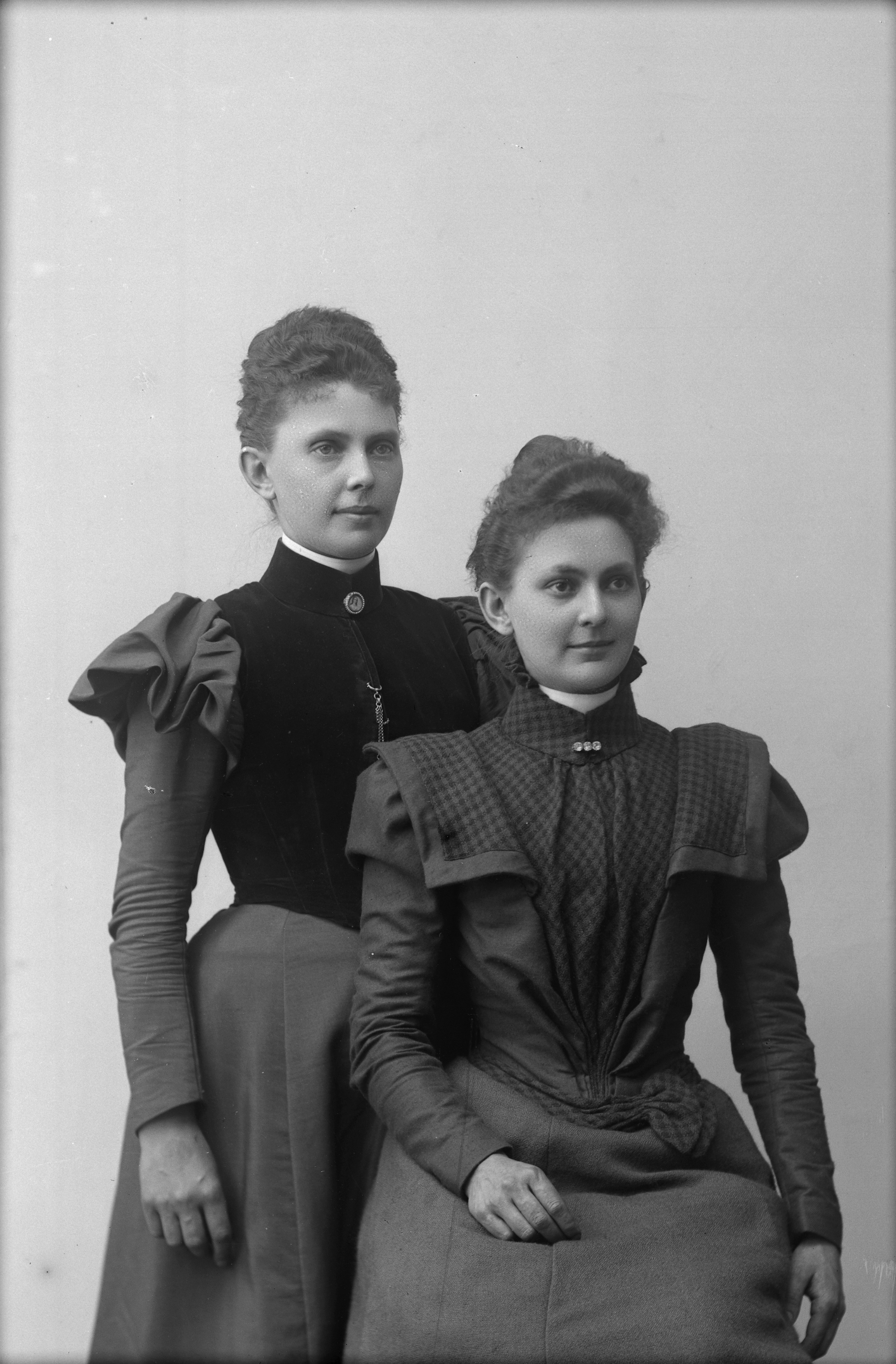Beskrivning: Porträtt i helfigur av Anna Ahlgren med okänd kvinna.