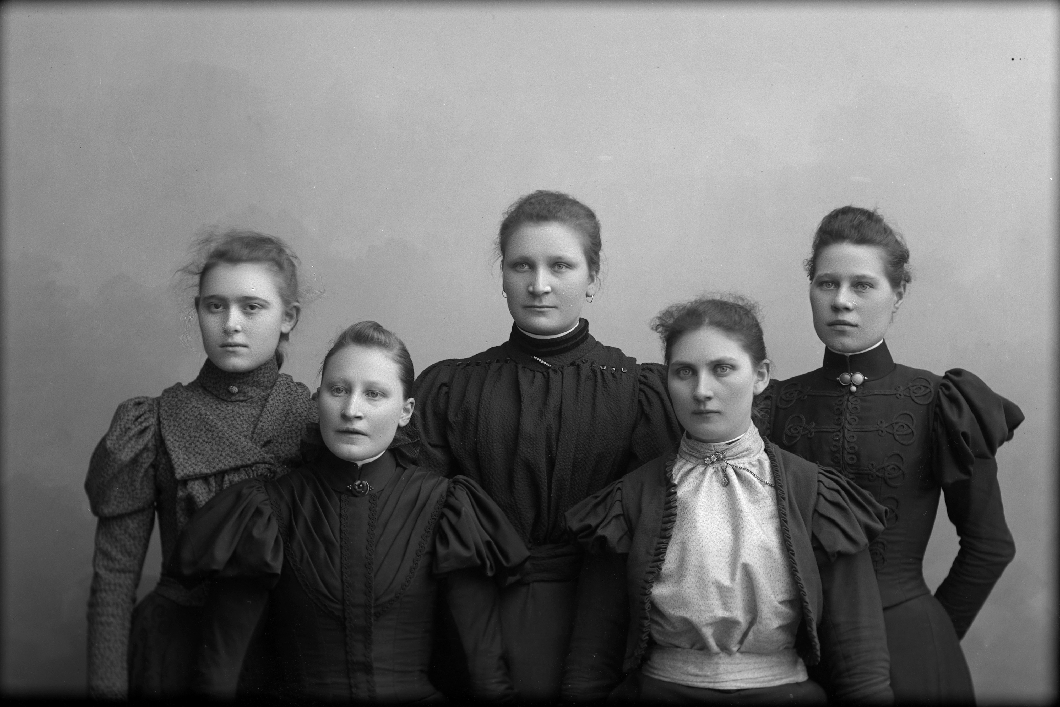 Porträtt i halvfigur av Maria Andersson med okänt sällskap, fyra andra kvinnor.