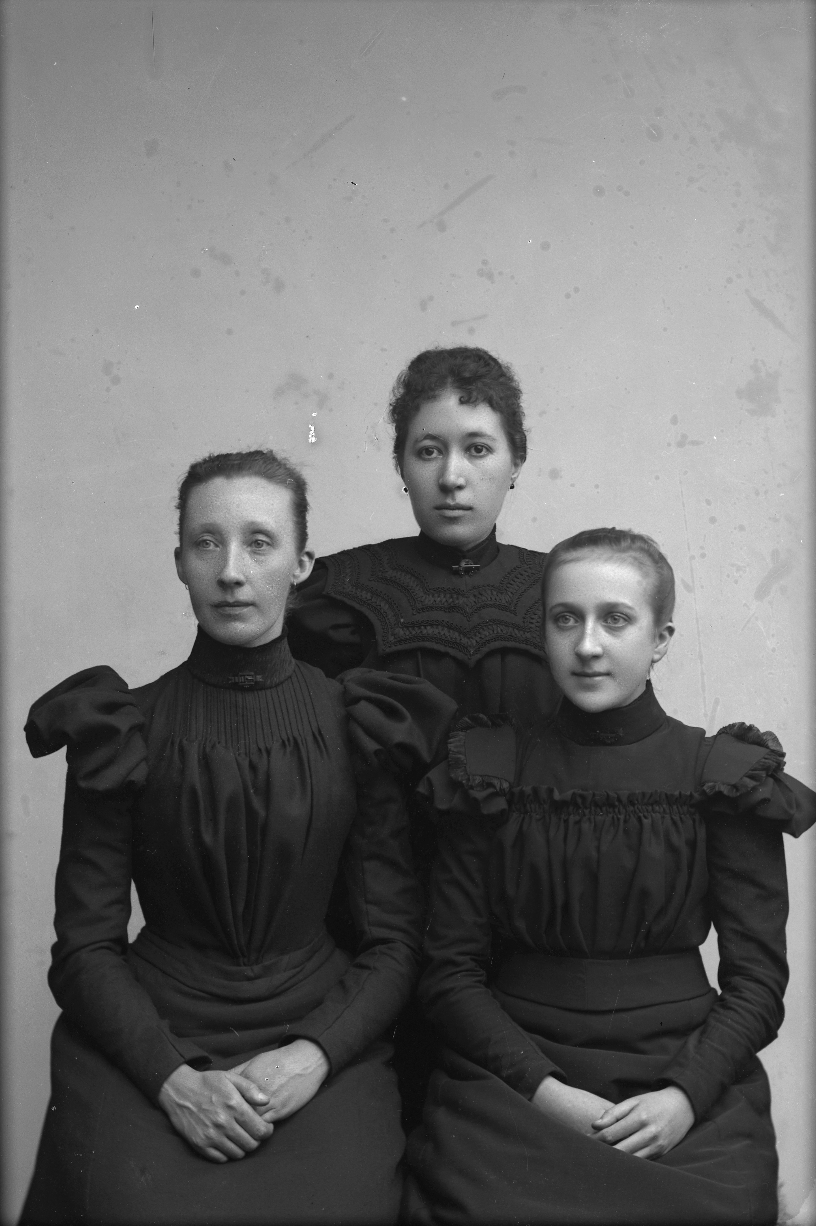 Porträtt i helfigur av Maria Jönsson med okänt sällskap, två andra kvinnor.