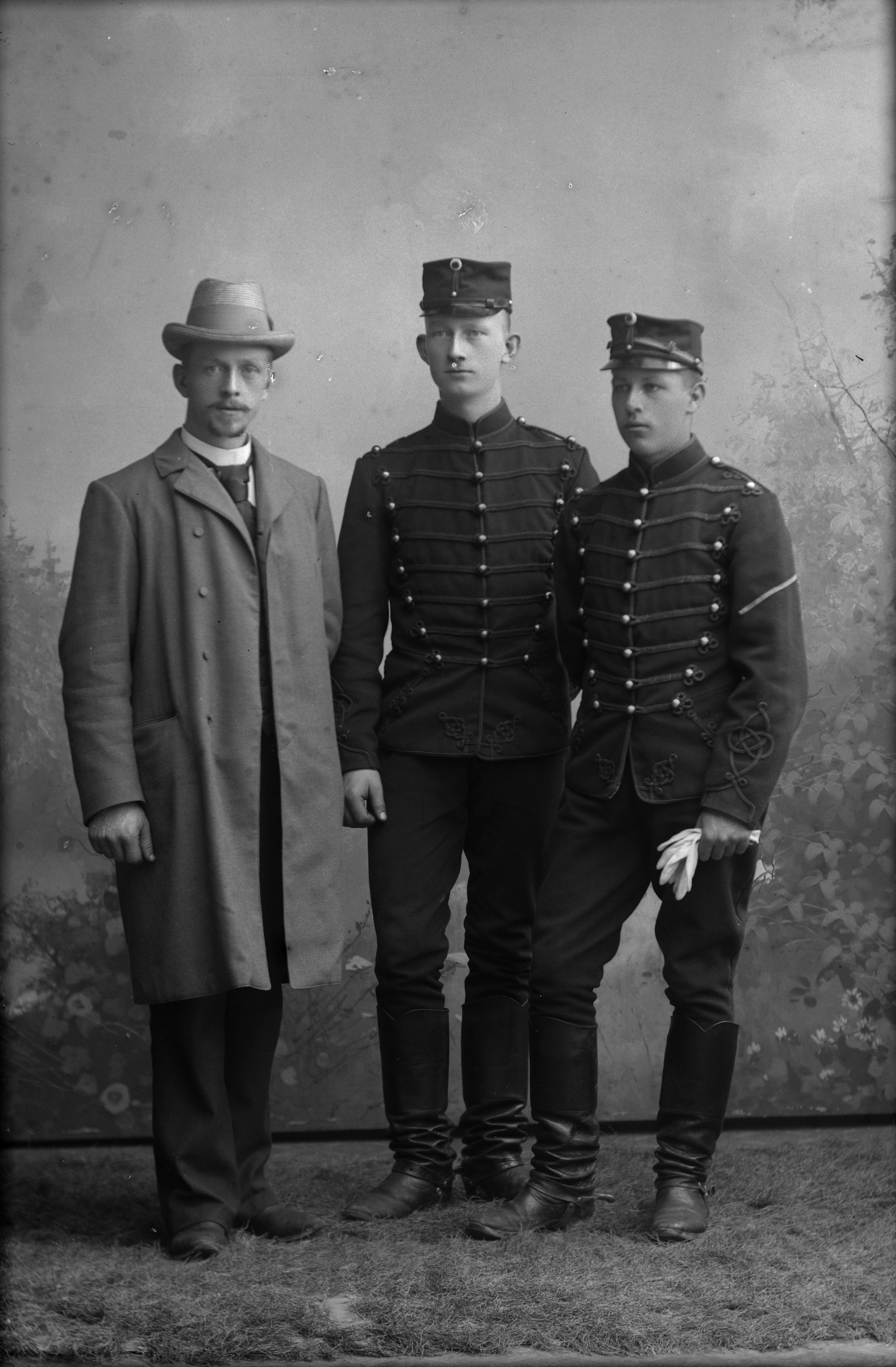 Porträtt i helfigur av husar Börjesson med okänd husar och en tredje man, iklädd hatt och rock. Husarerna iklädda minitäruniform. Fotograferade framför ateljéfond med skogs- och blomstermotiv.