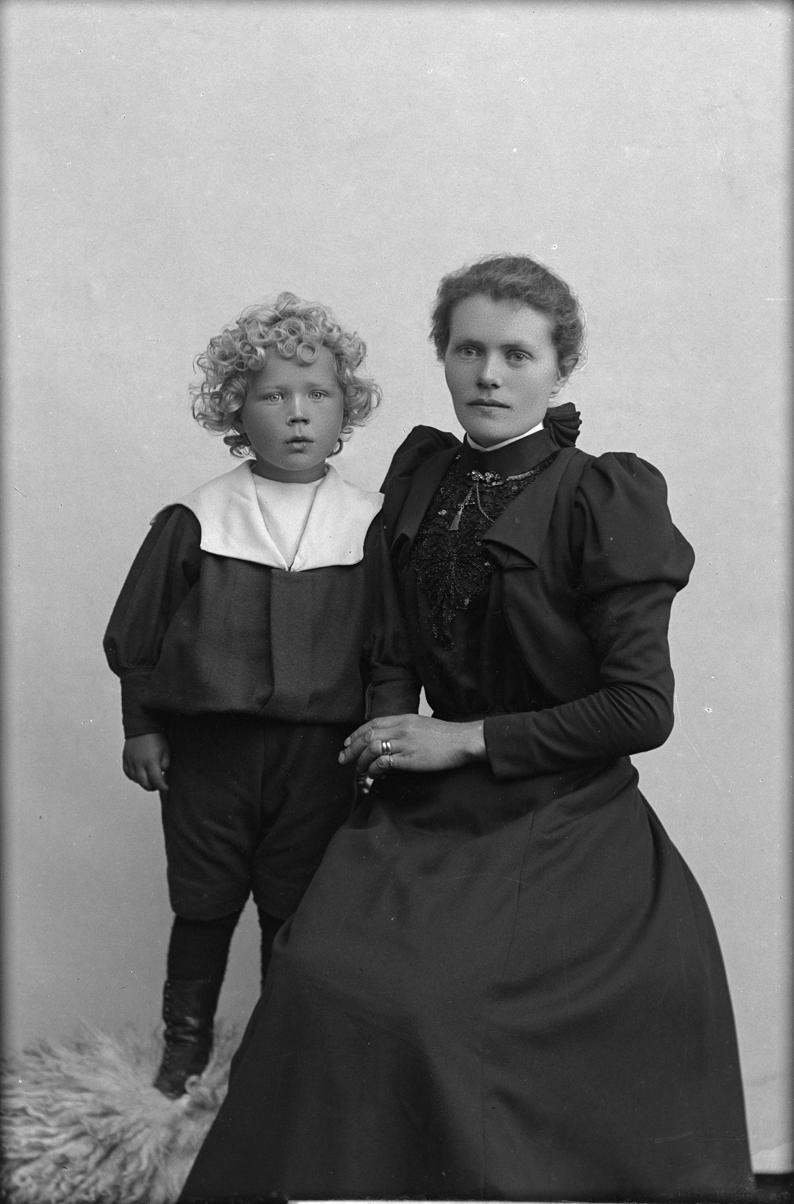 Beskrivning: Porträtt i helfigur af fru Hermodsson med son. Sonen iklädd sjömanskostym.