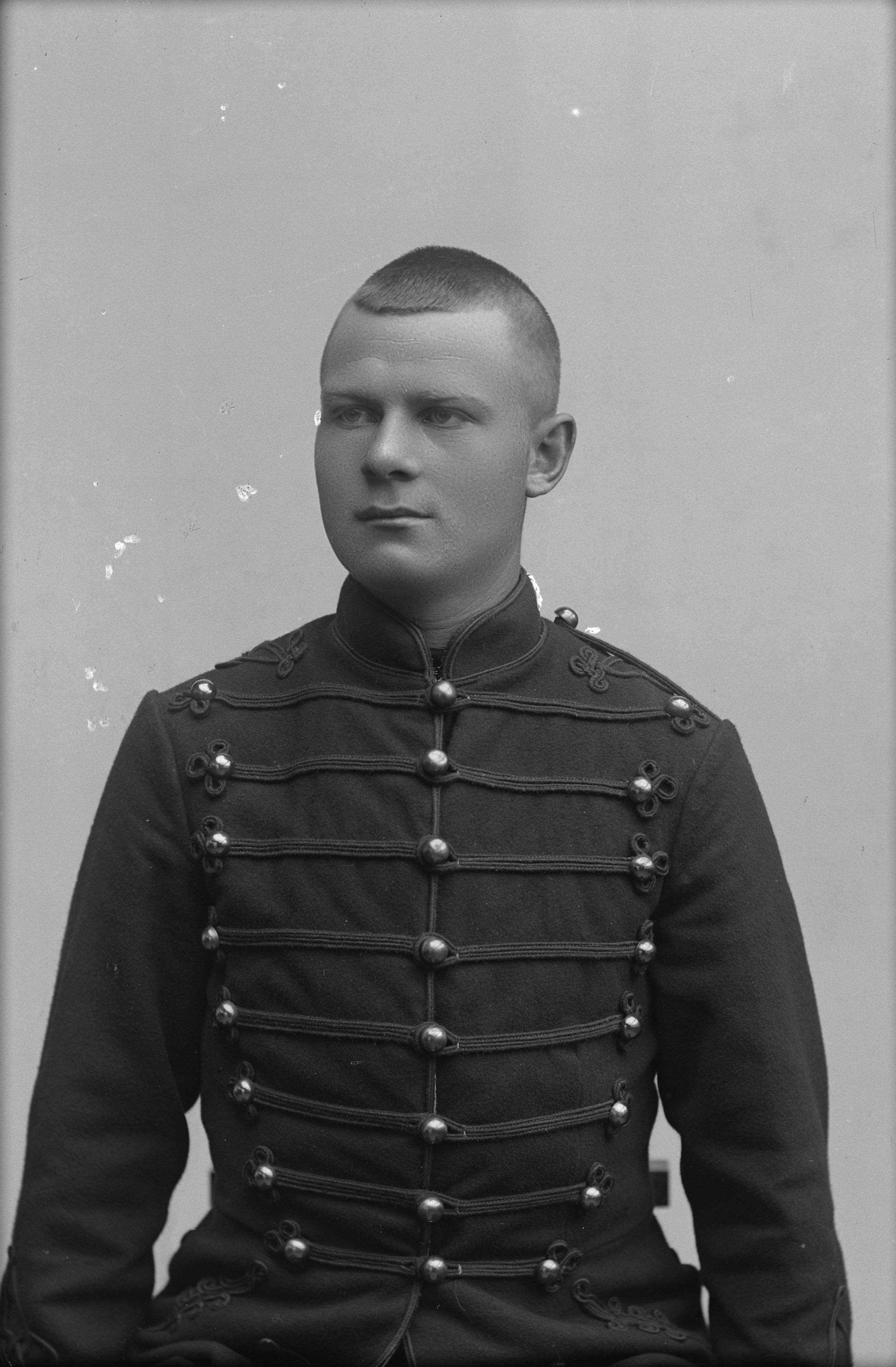 Porträtt halvfigur av soldat Blomquist, iklädd militäruniform.