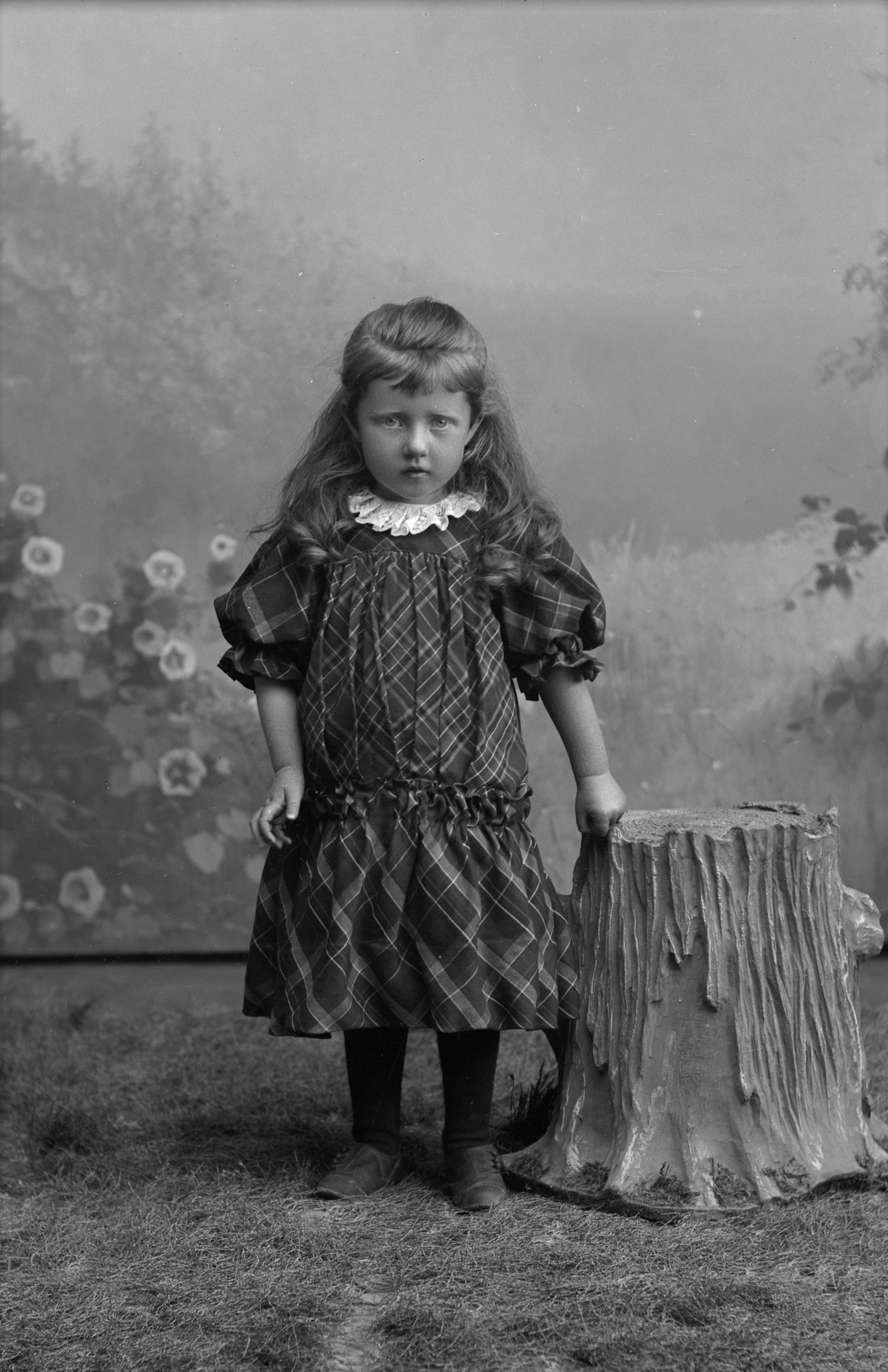 Porträtt i helfigur Christian Hanssons dotter, stående vid stubbe, fotograferad framför ateljéfond med skogs- och blomstermotiv.