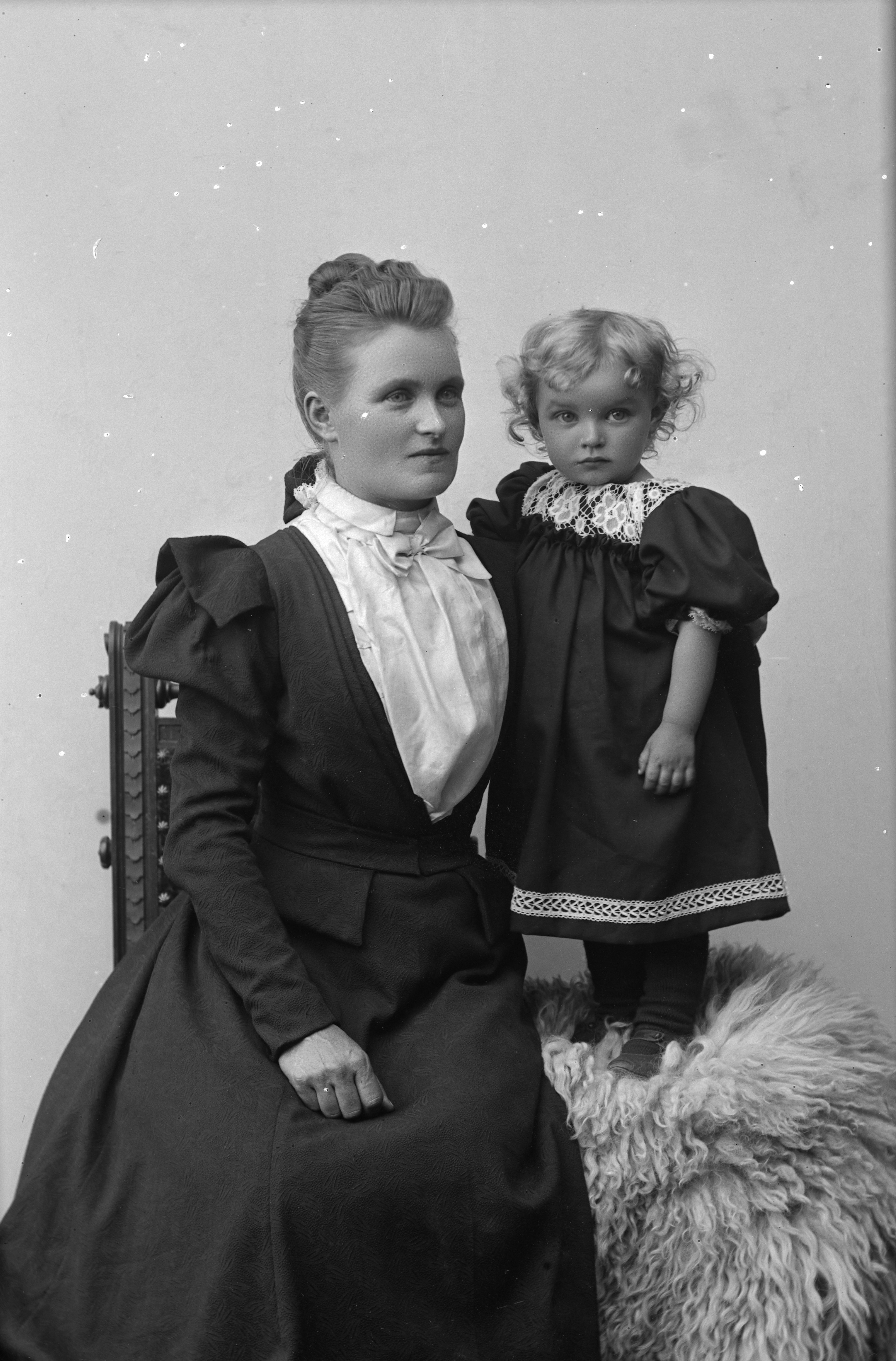 Beskrivning: Porträtt i helfigur av fru Bergendorff med sitt barn. Barnet stående på fäll.