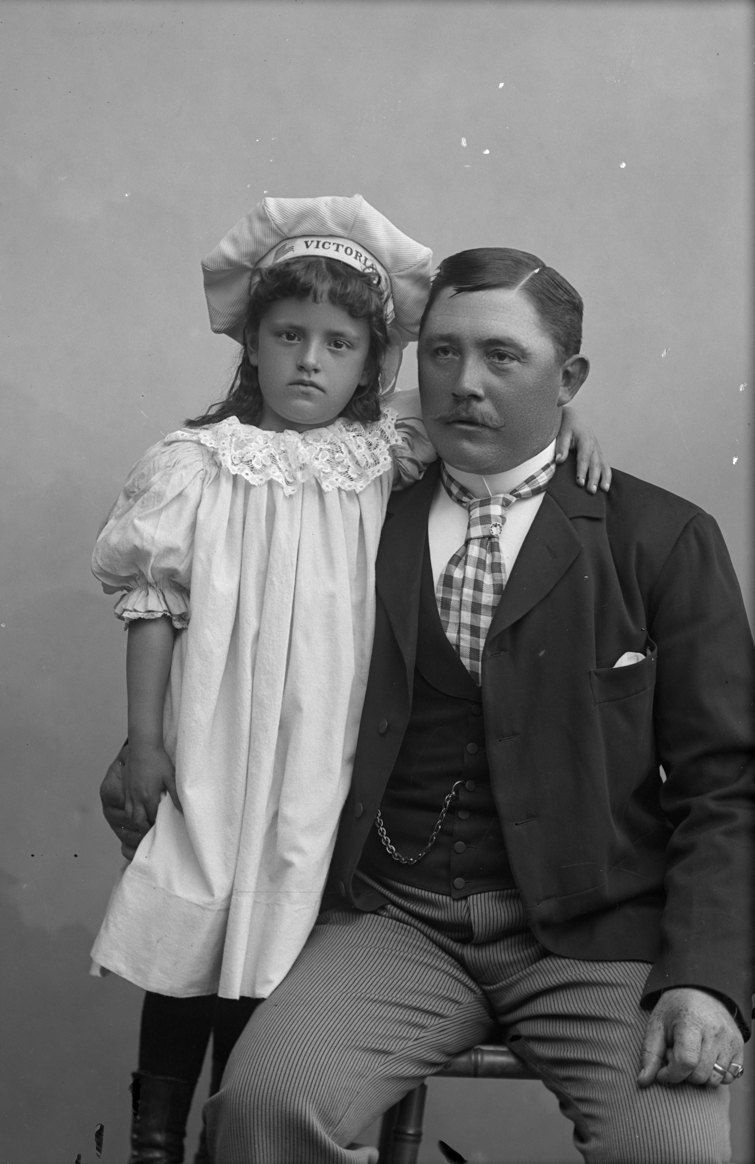 Porträtt i helfigur av sjökapten Carl Gjörloff med dottern Alice. Fadern sittande, dottern iklädd mössa, broderad "Victoria".