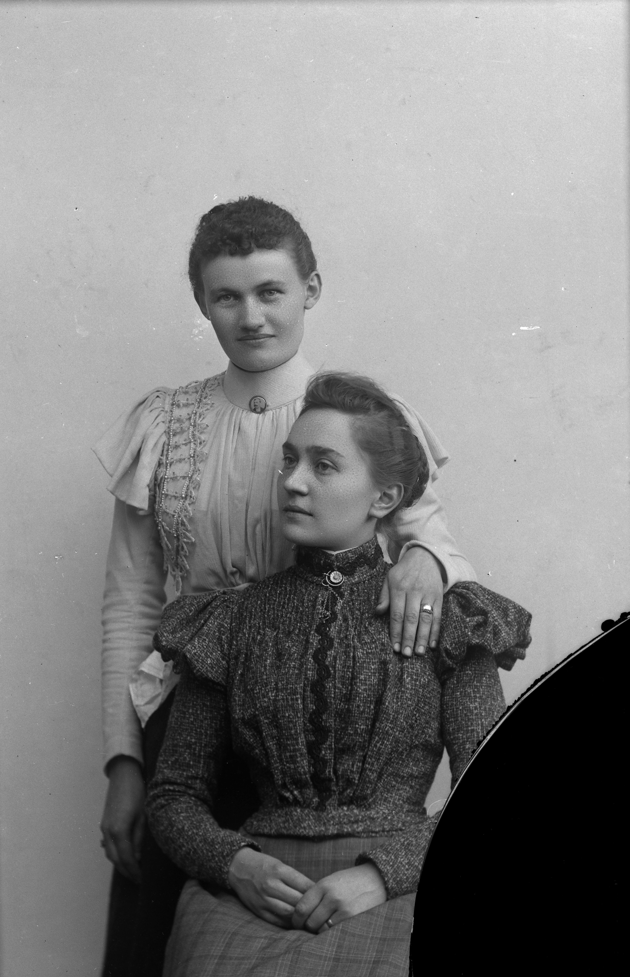 Porträtt i helfigur av Anna Olsson med okänd kvinna, möjligen Eva Hultberg, sittande och stående /Eslöv.
