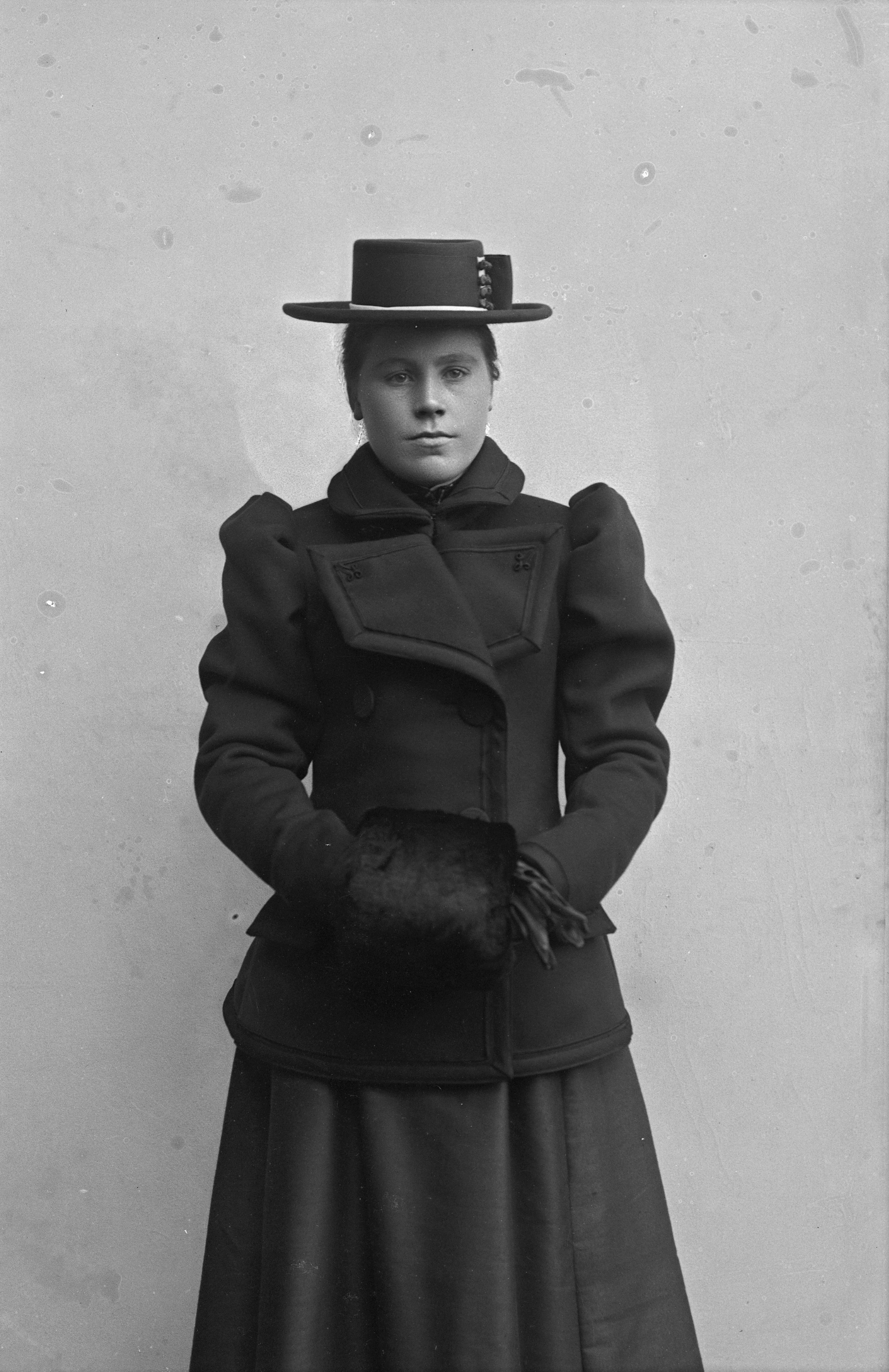 Porträtt i helfigur av Sigrid Löfstedt, iklädd hatt och kappa.