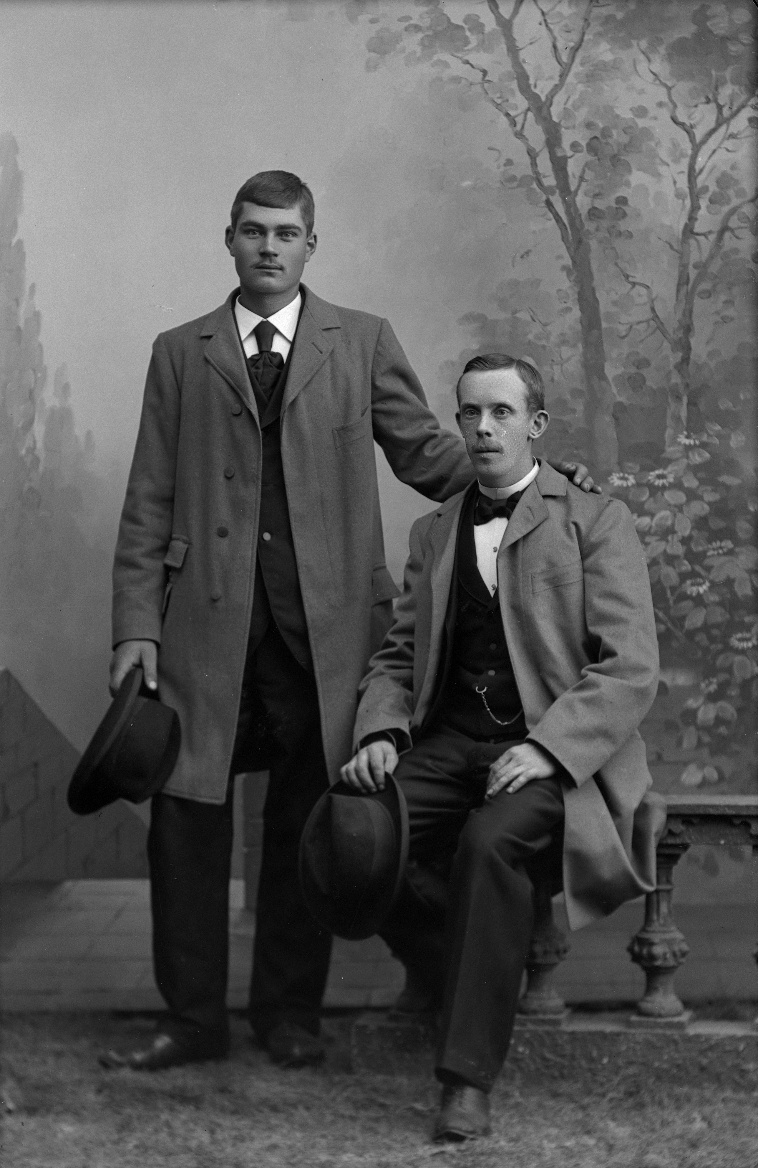 Porträtt i helfigur av C. Jönsson med okänd man. En av männen sittande på stenstaket med balustrad. Båda iklädda rockar, hållande hattar. Fotograferade framför ateljéfond med skogs- och blomstermotiv.