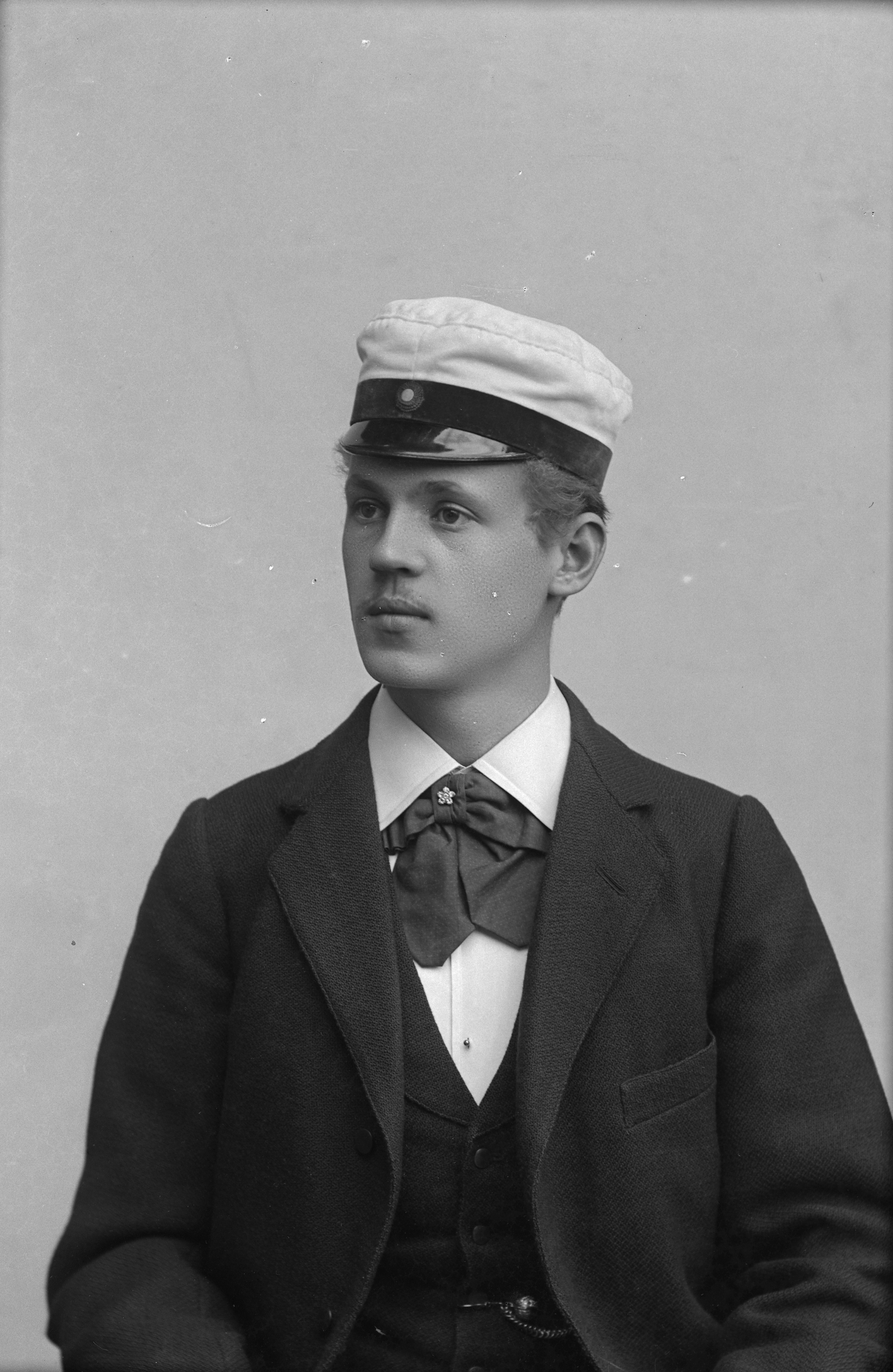 Porträtt i halvfigur av F. Carlberg, iklädd studentmössa.