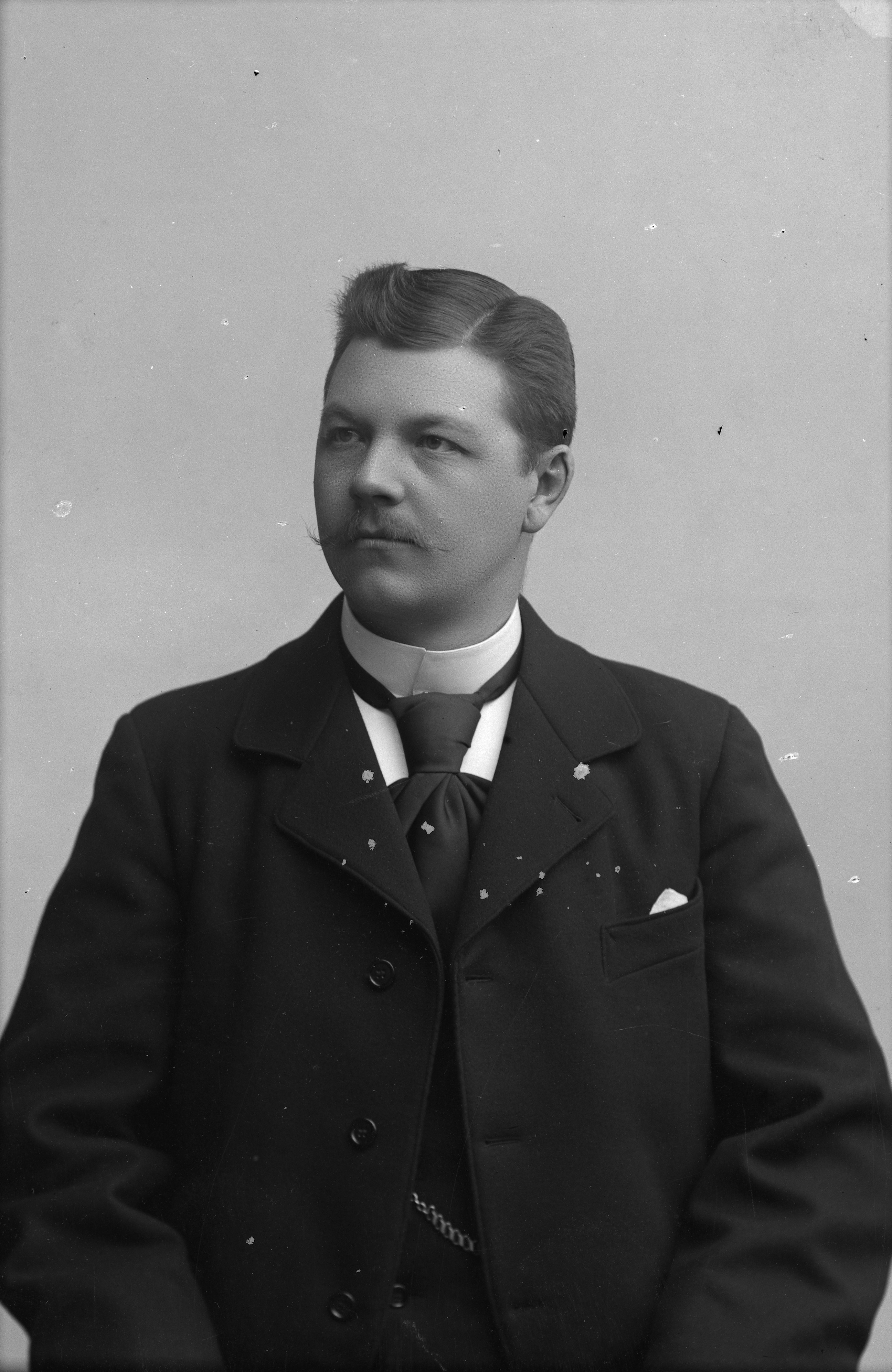 Beskrivning: Porträtt i halvfigur av kontorschef Henriksson vid Malmö Mekaniska Trikåfabrik.
