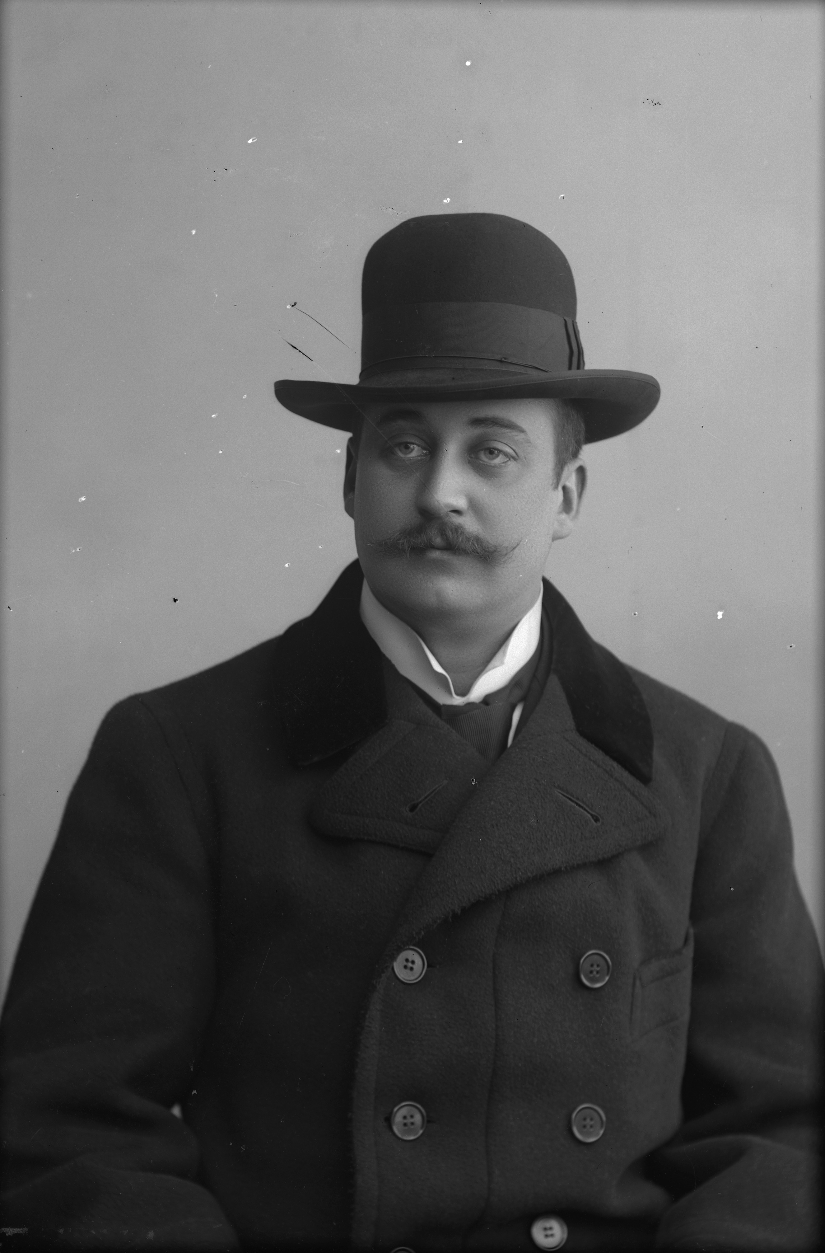Porträtt i halvfigur av herr Hofving, iklädd hatt och ytterrock /Kvidinge.