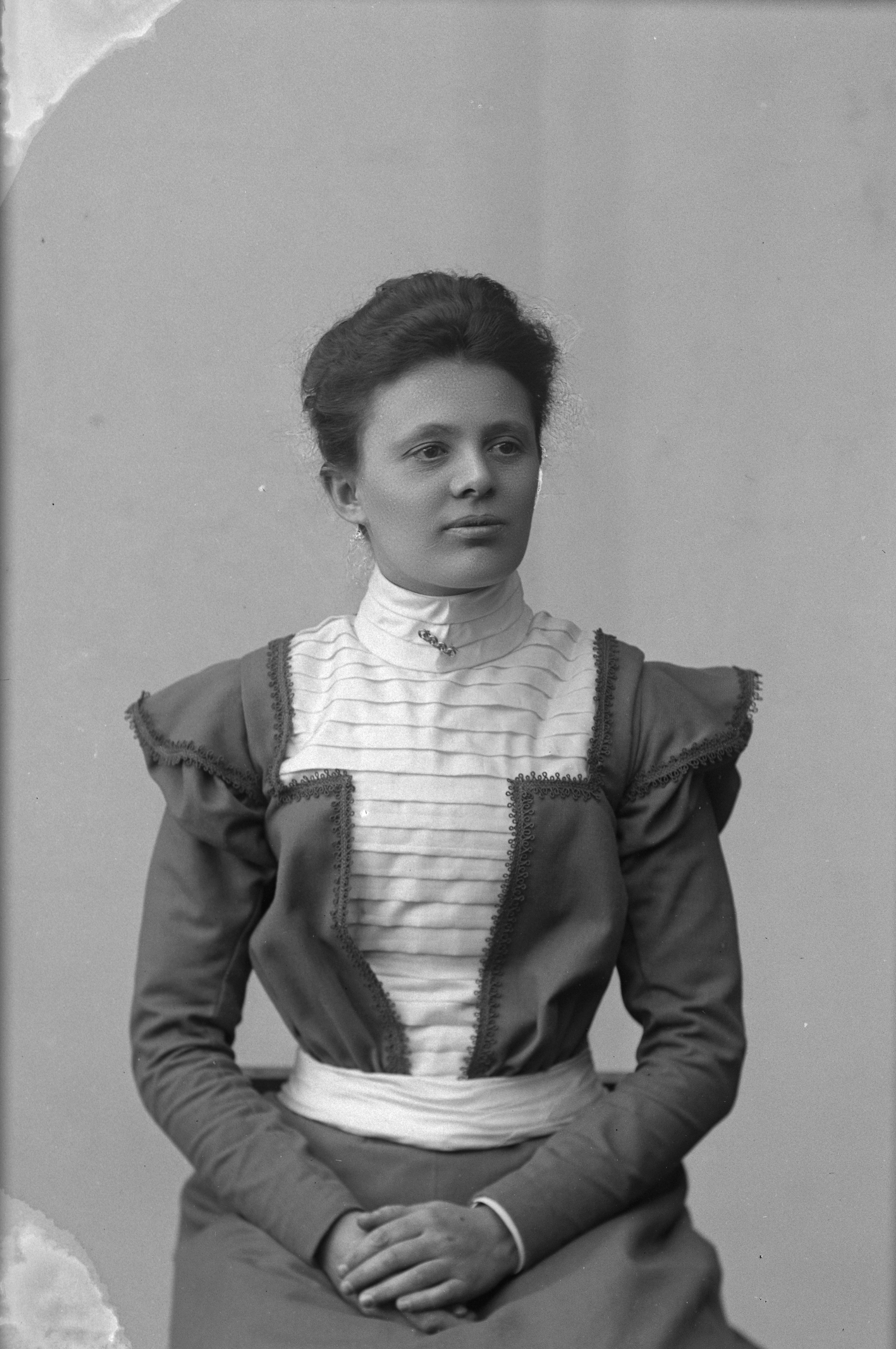 Beskrivning: Porträtt i halvfigur av Augusta Nilsson.