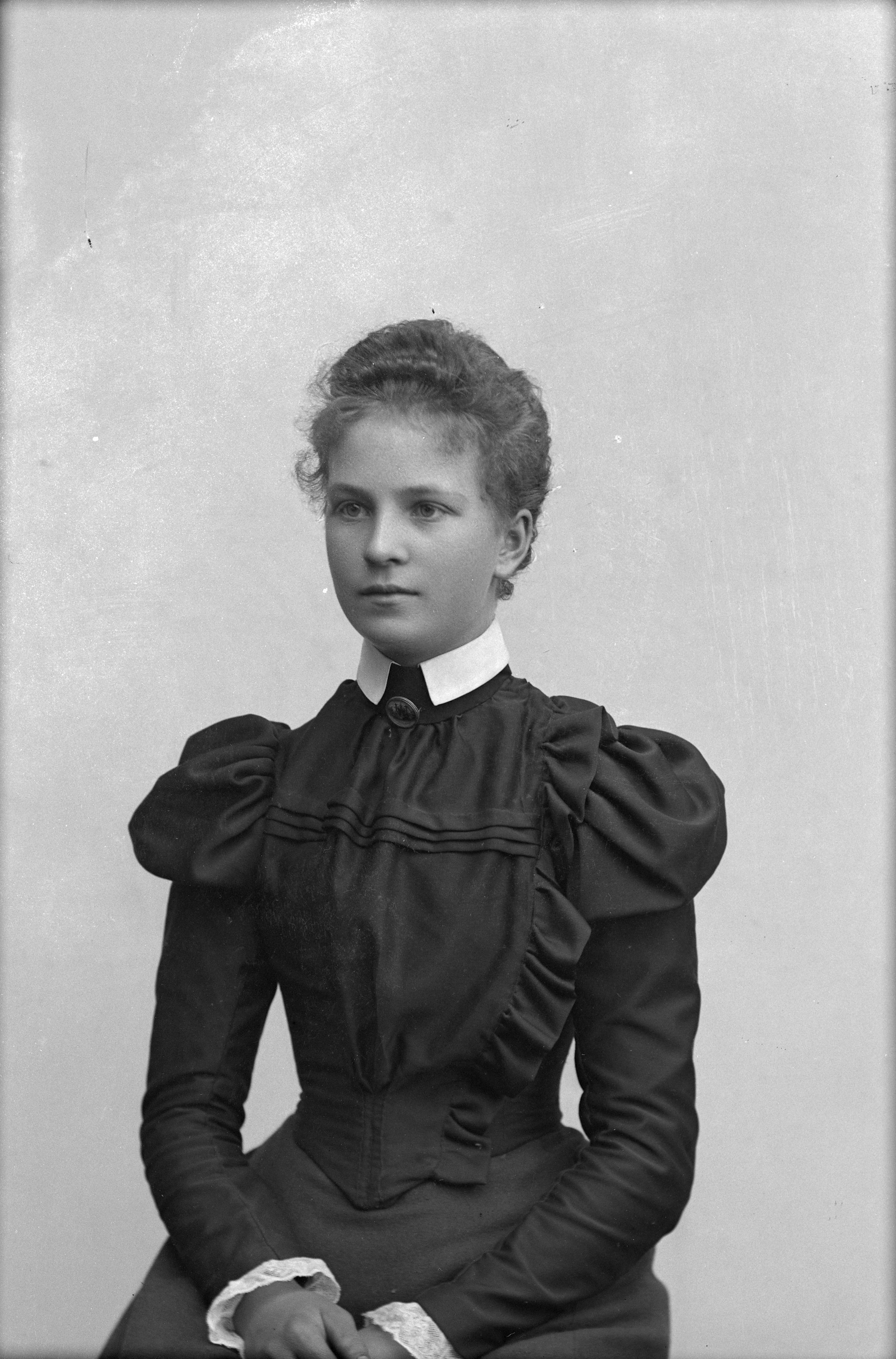 Beskrivning: Porträtt i halvfigur av Hulda Larsson.