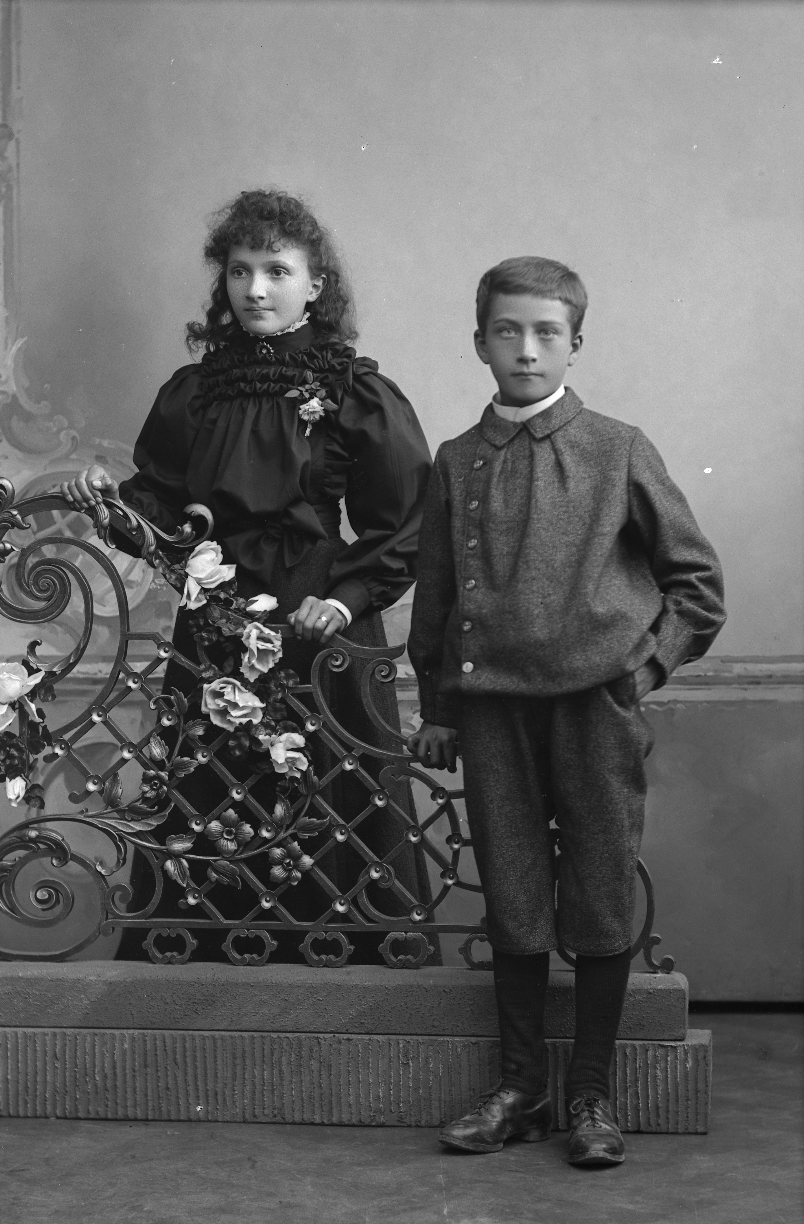 Beskrivning: Porträtt i helfigur av Selma Olsson med broder. Selma stående vid spaljé dekorerad med blommor.