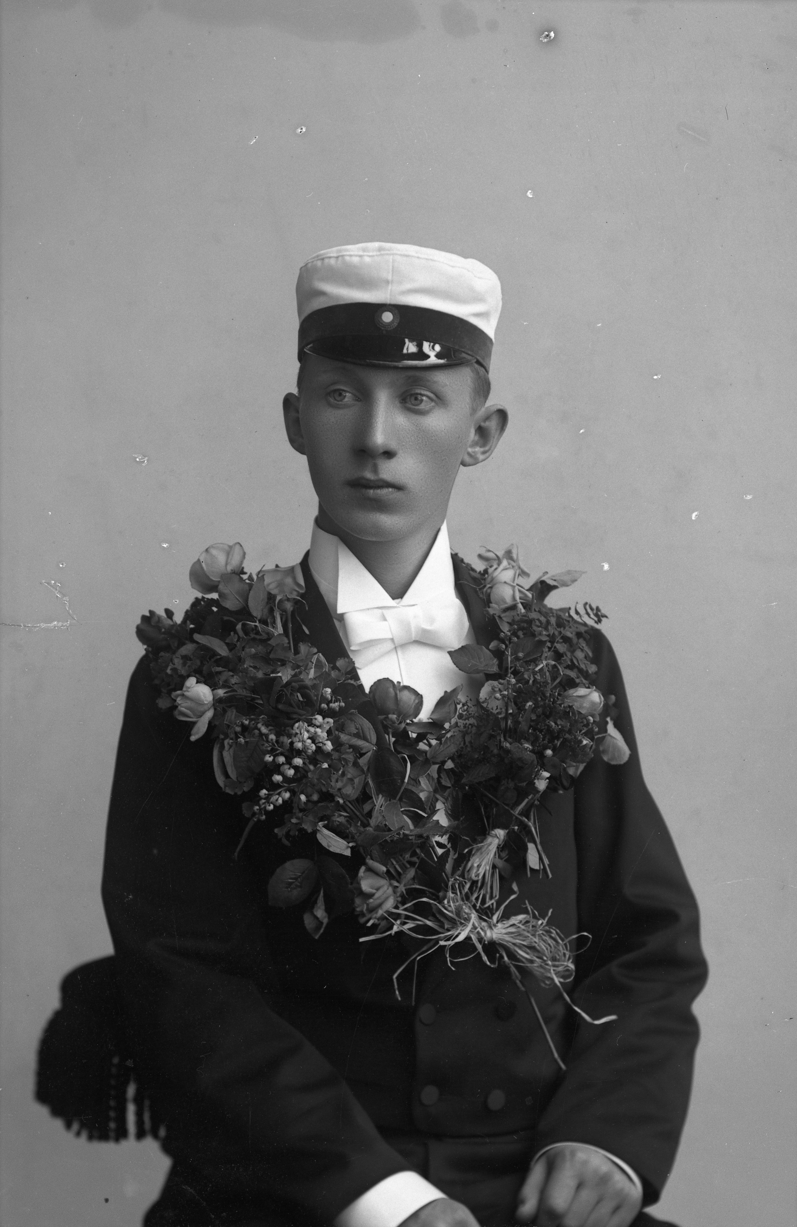 Porträtt i halvfigur av herr Strömer, iklädd studentmössa, men blomsterkrans runt halsen.