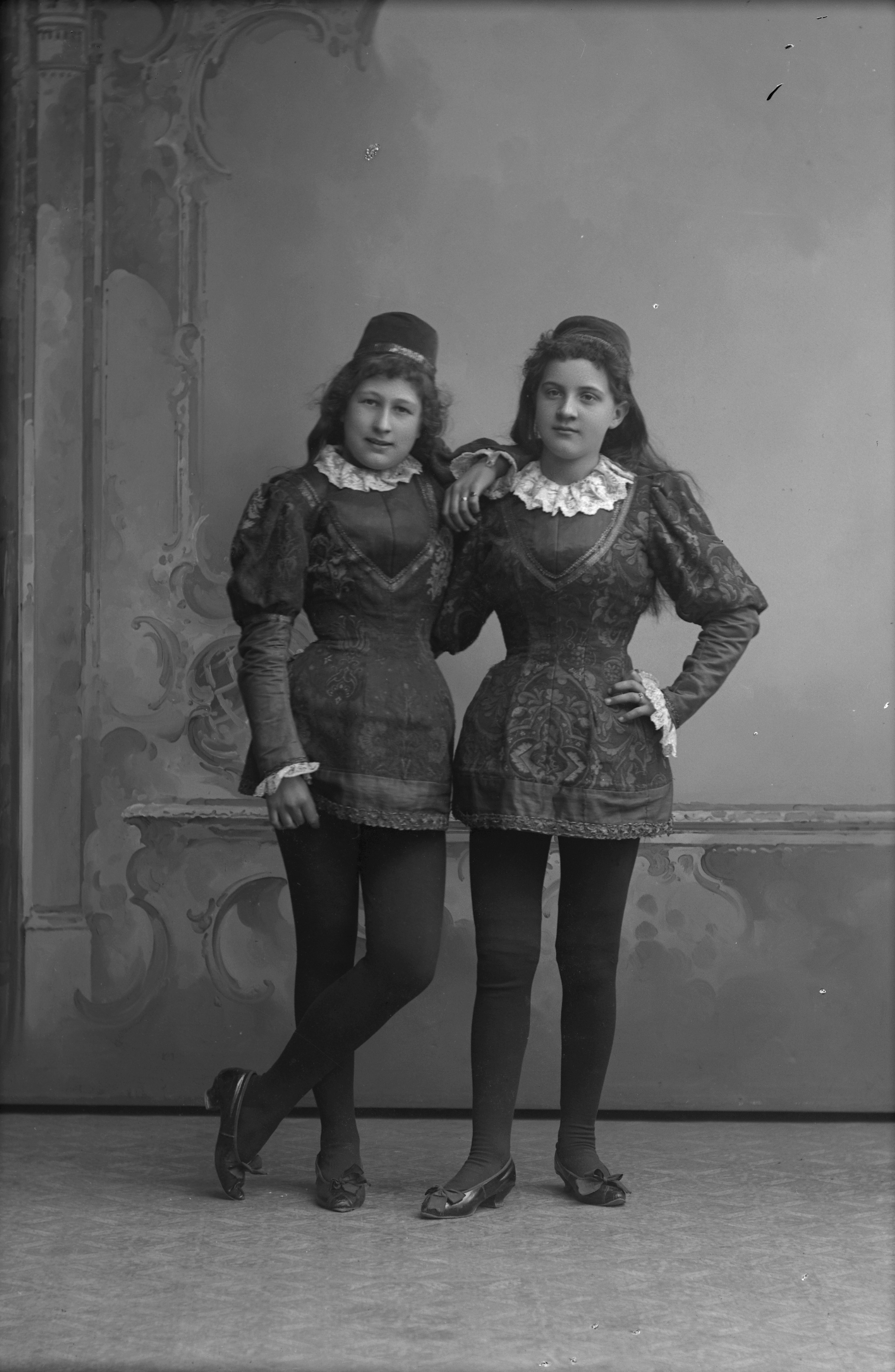 Porträtt i helfigur av Ester Andersson med okänd kvinna, iklädda hattar.