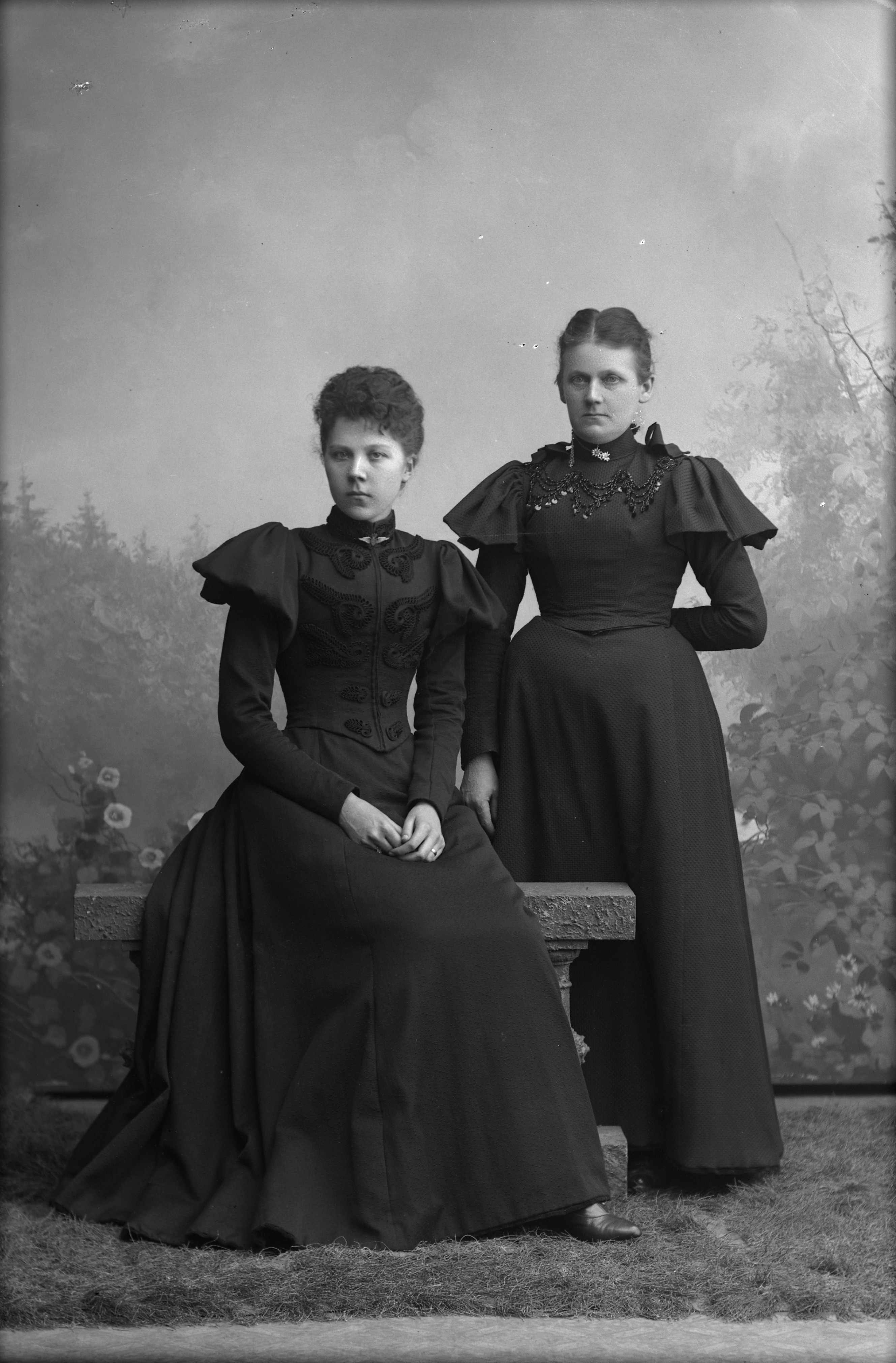 Porträtt i helfigur av fru Nilsson med okänd kvinna, sittande och stående. Fotograferade framför ateljéfond med skogs- och blomstermotiv.