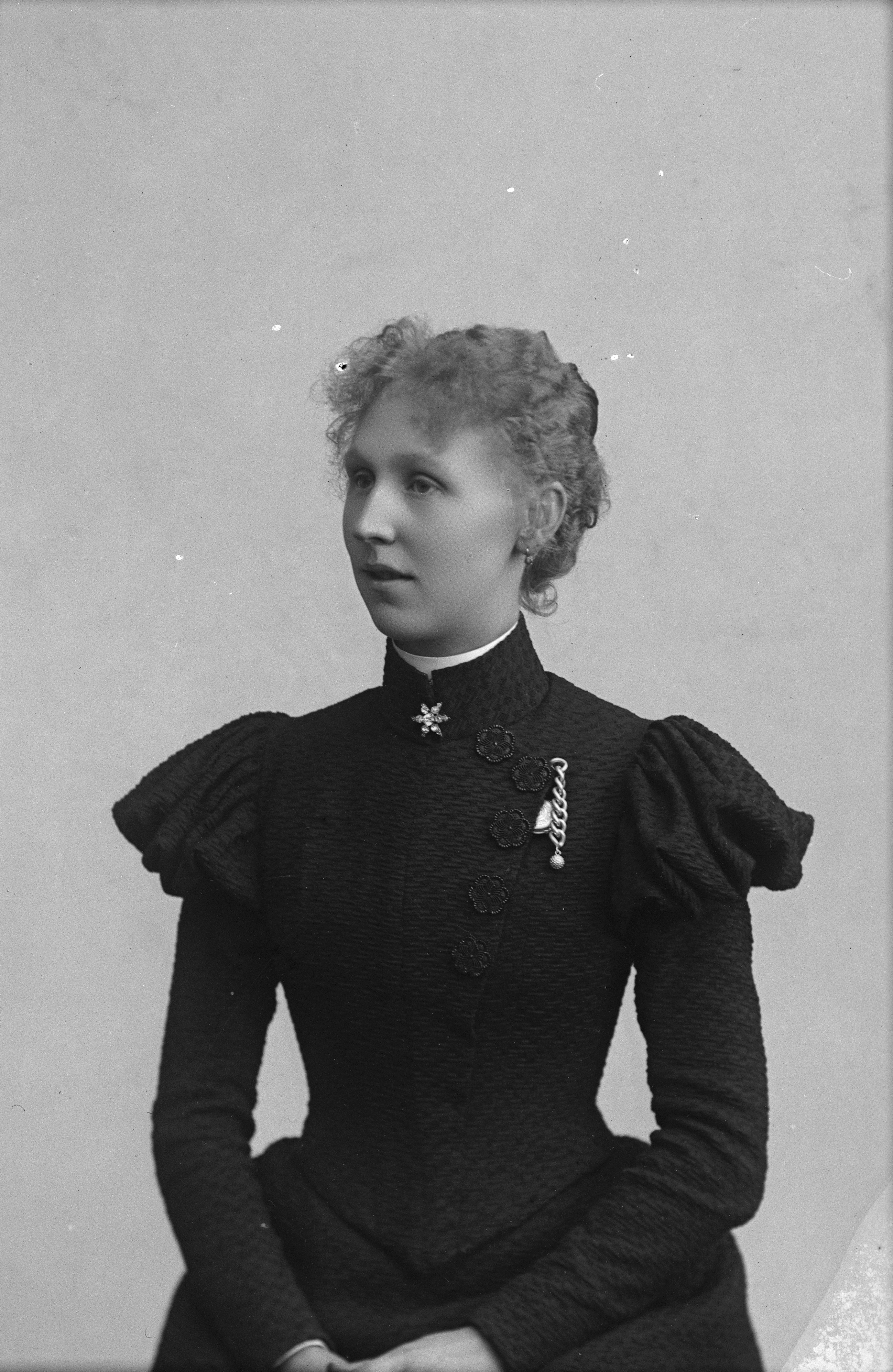 Beskrivning: Porträtt i halvfigur av Karin Dahl.