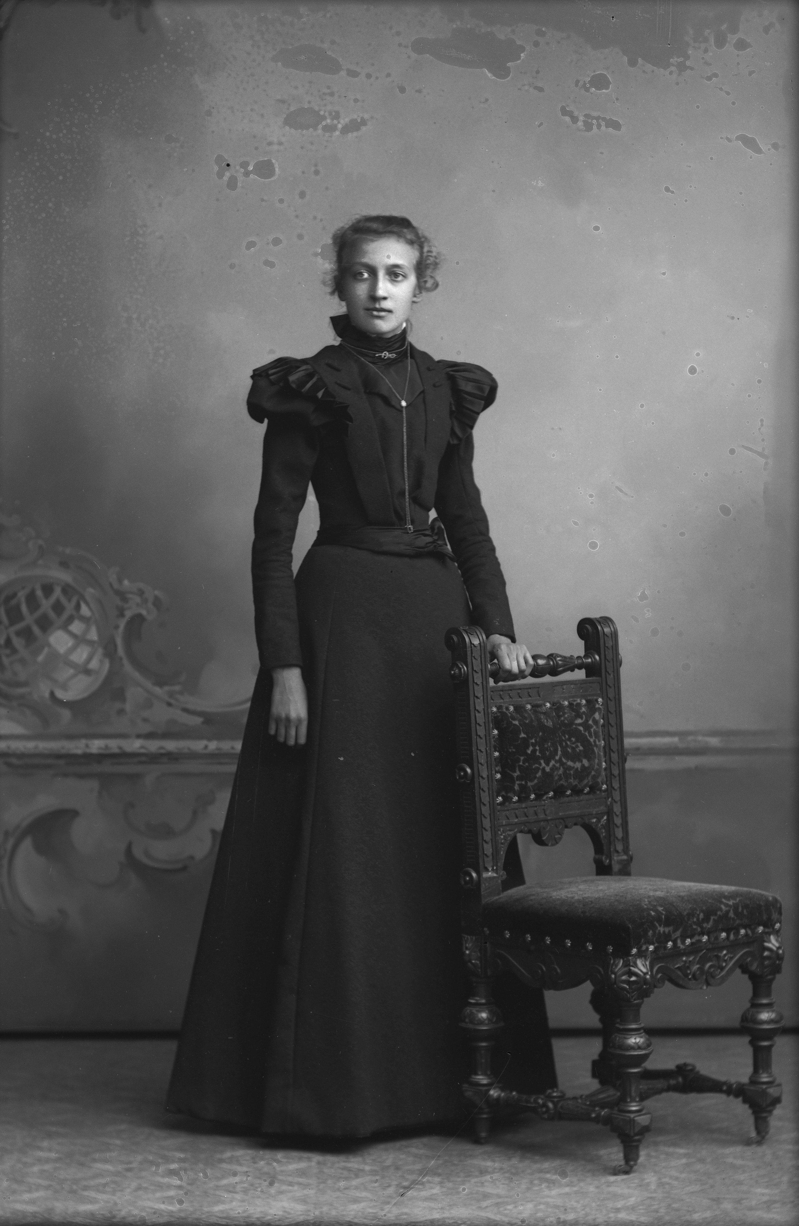 Porträtt i helfigur av Ida Rosenquist, stående vid stol.