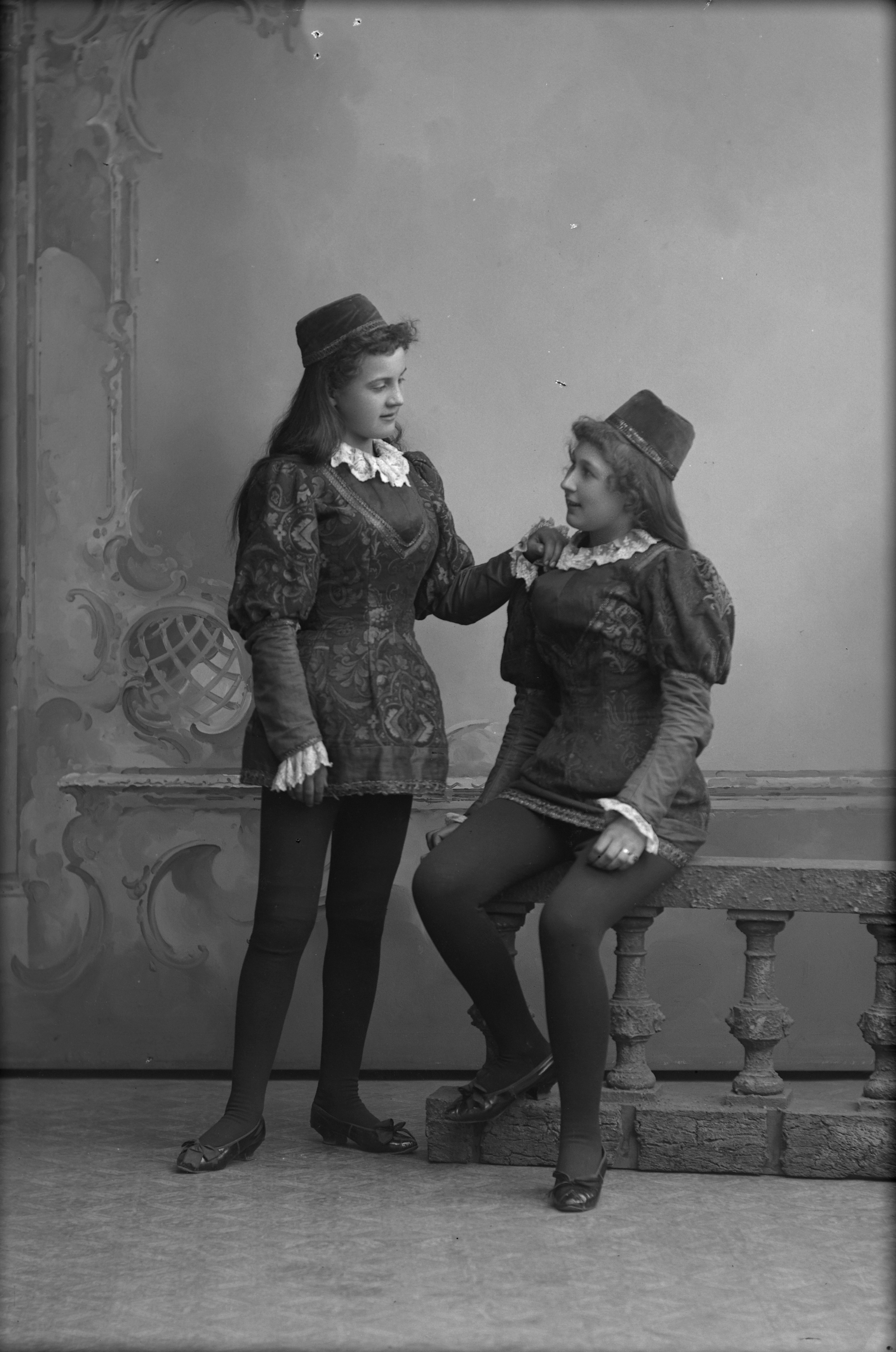 Porträtt i helfigur av Ester Andersson med okänd kvinna, iklädda hattar.