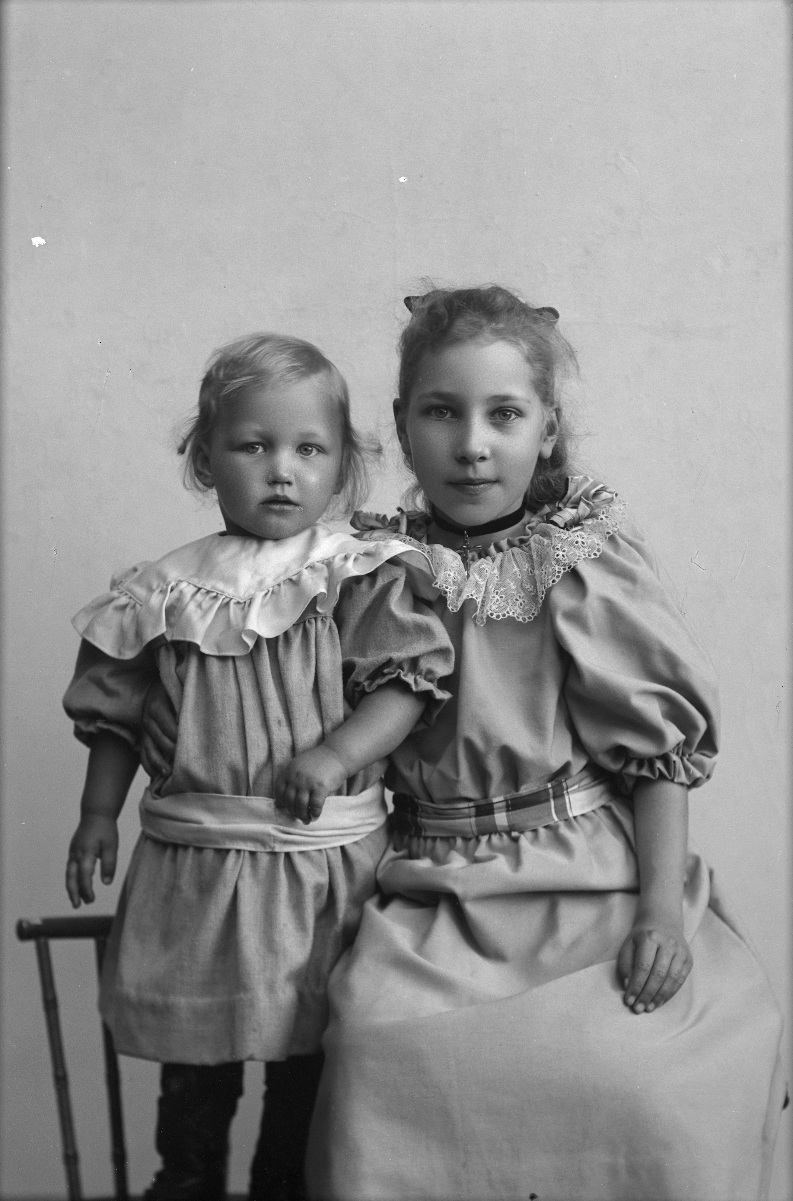 Porträtt i helfigur av Rundqvists son och dotter. Dottern sittande på stol, sonen stående bredvid på stolen.