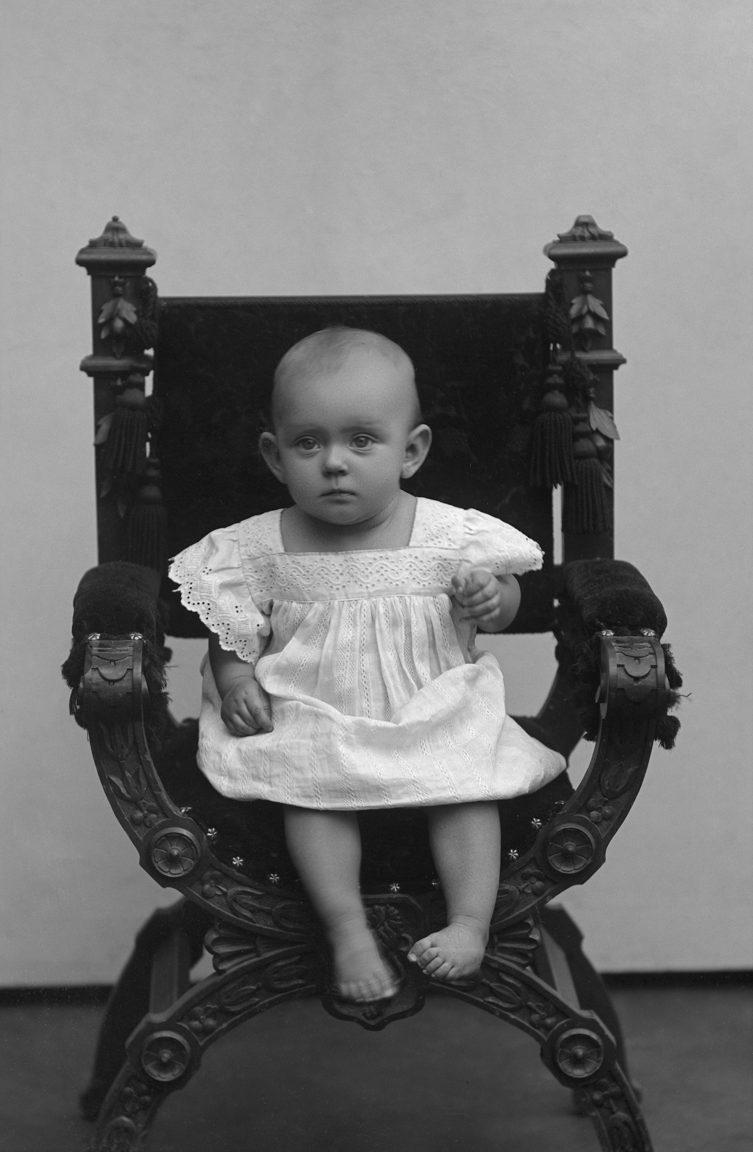 Porträtt i helfigur av fru Alströms dotter, sittande på stol.