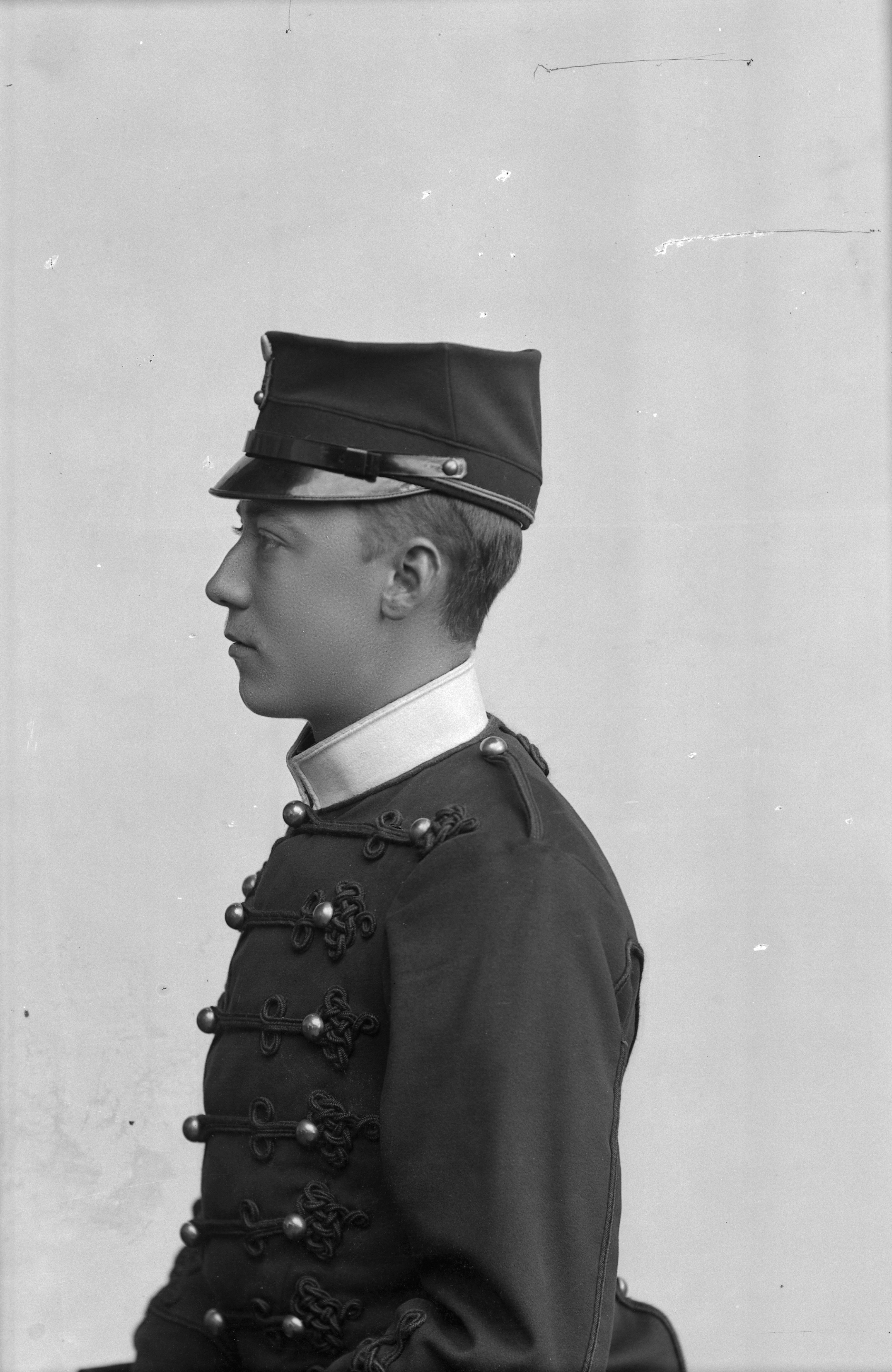 Porträtt i halvfigur, profil, av O. Sjöholm, iklädd militäruniform och -mössa.