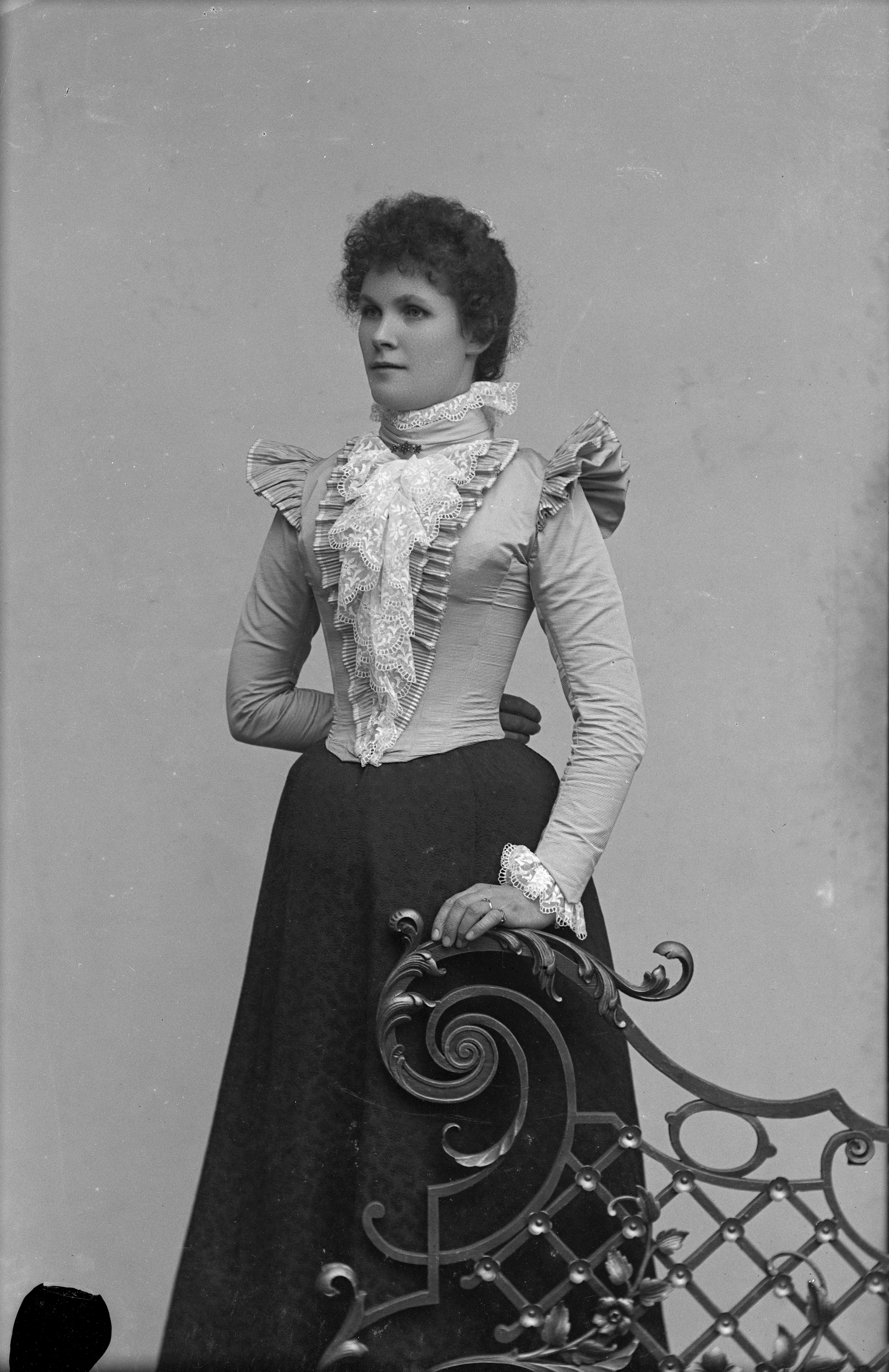 Porträtt i helfigur av Ingrid Andersson, stående vid spaljé.