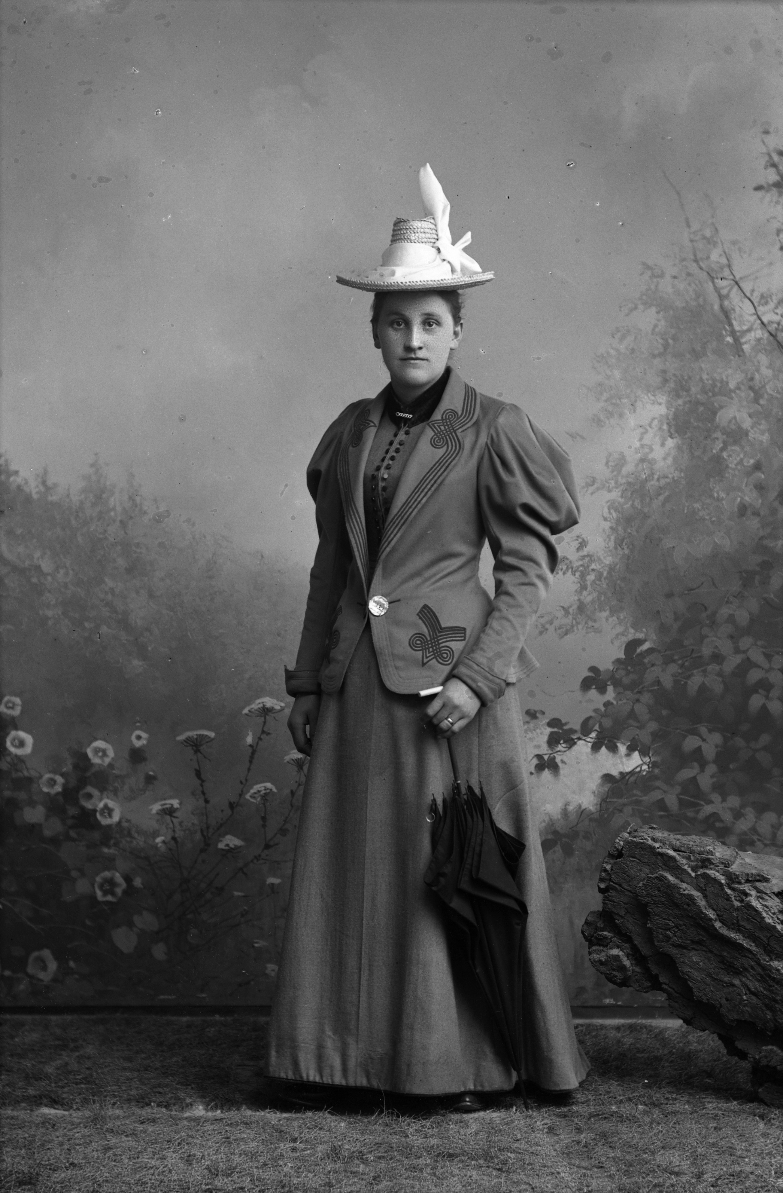 Porträtt i helfigur av Elna Andersson, iklädd hatt och kappa, hållande parasoll. Fotograferad framför ateljéfond med skogs- och blomstermotiv.