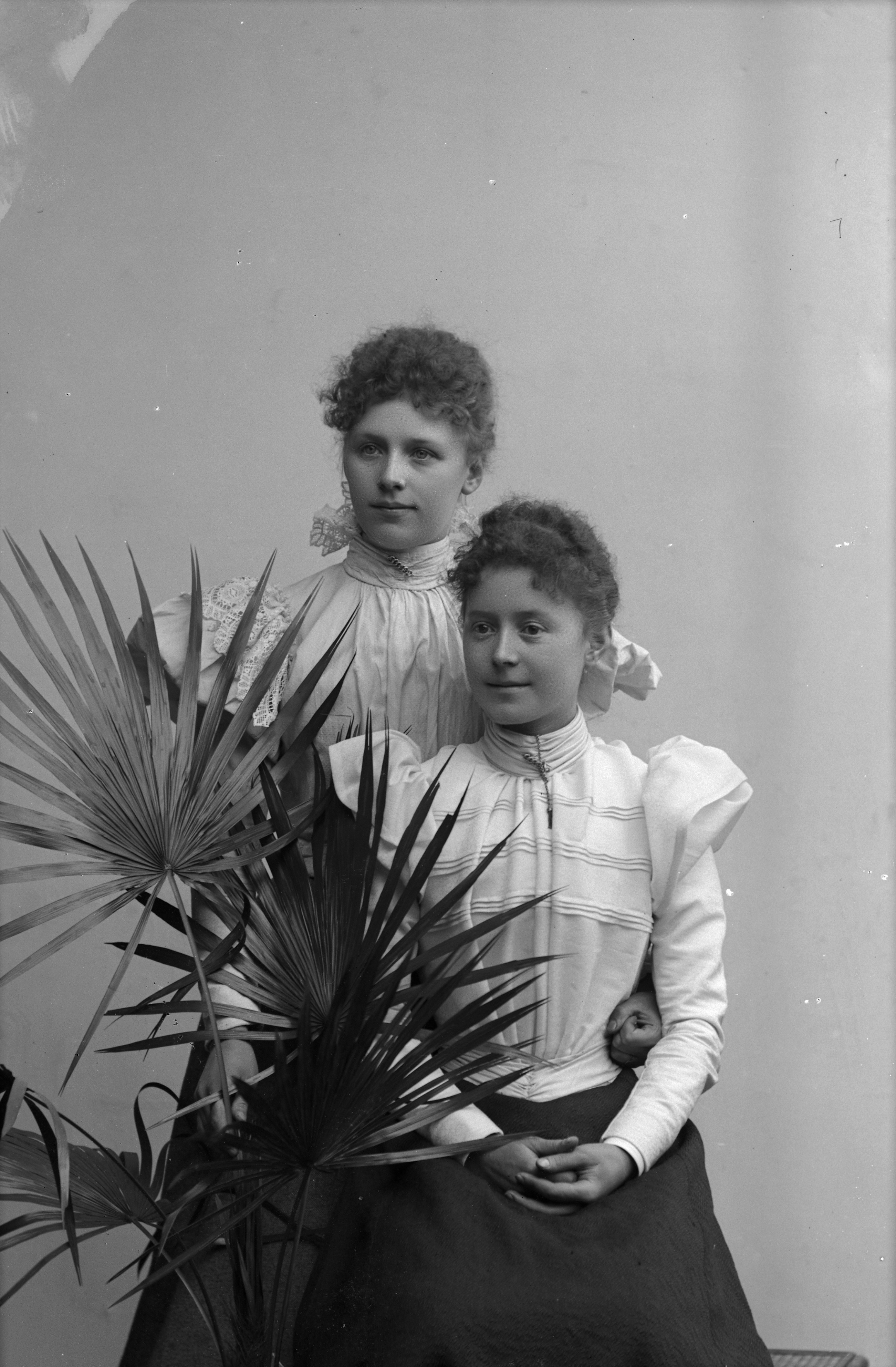 Porträtt i helfigur av Ellen Hansson med okänd kvinna, stående bakom stor växt.